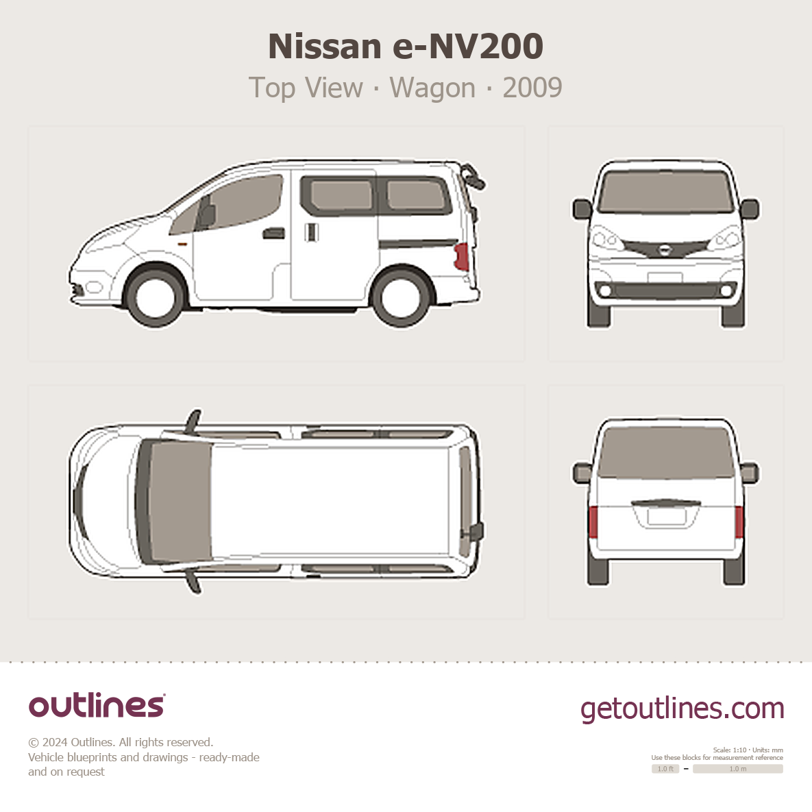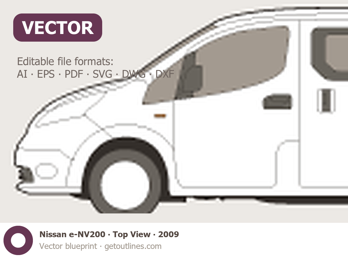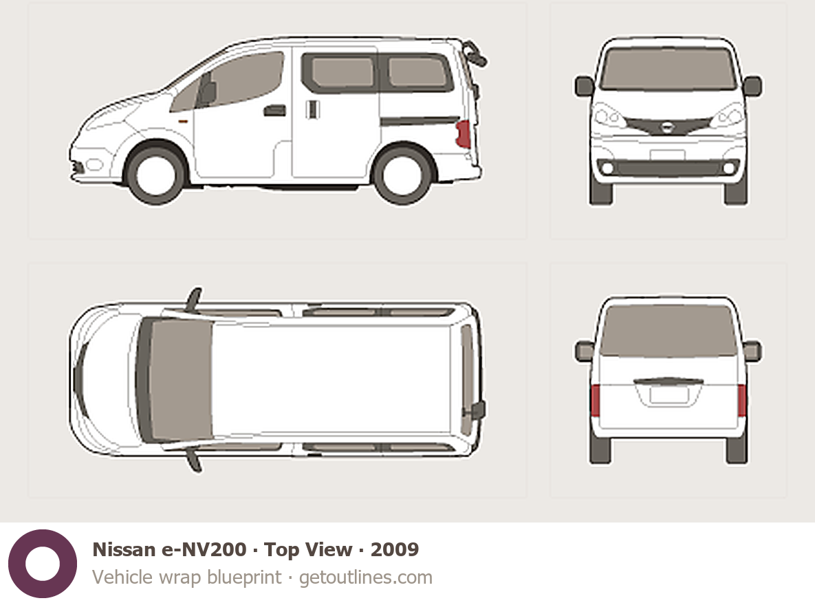 This 2009 Nissan e-NV200 Top View Wagon blueprint helps designers, wrap studios, and 3D artists simplify their workflow and save valuable time for creative work instead of routine tasks.