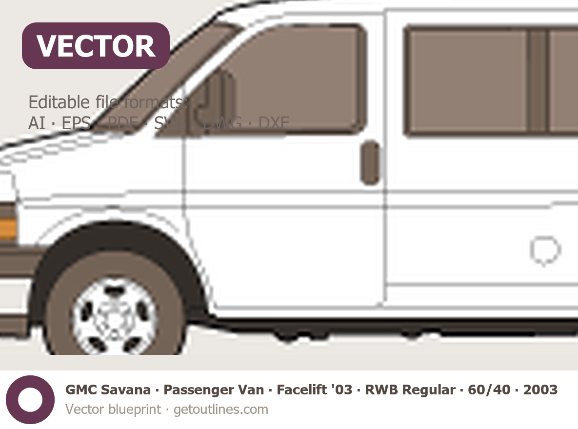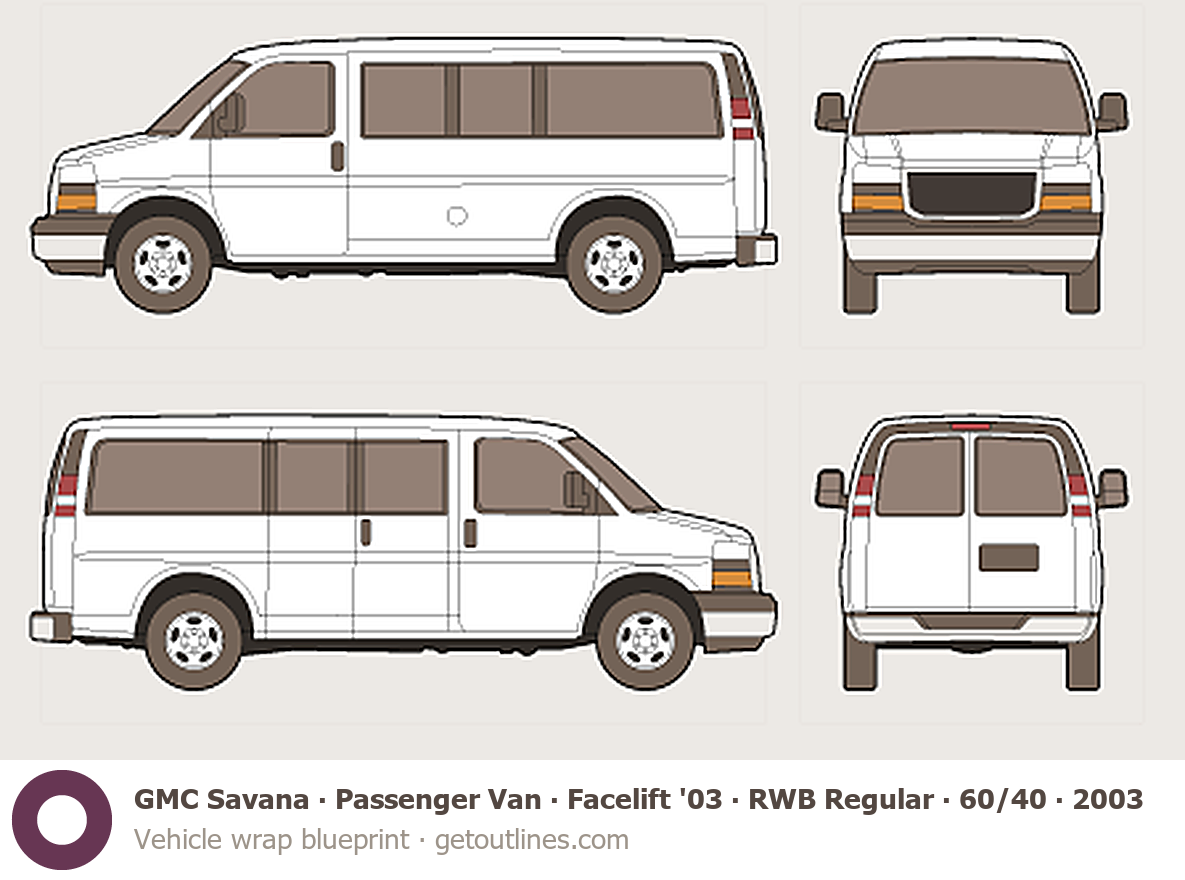 This 2003 GMC Savana Passenger Van ∙ Facelift '03 RWB Regular ∙ 60/40 Doors ∙ LT Van blueprint helps designers, wrap studios, and 3D artists simplify their workflow and save valuable time for creative work instead of routine tasks.
