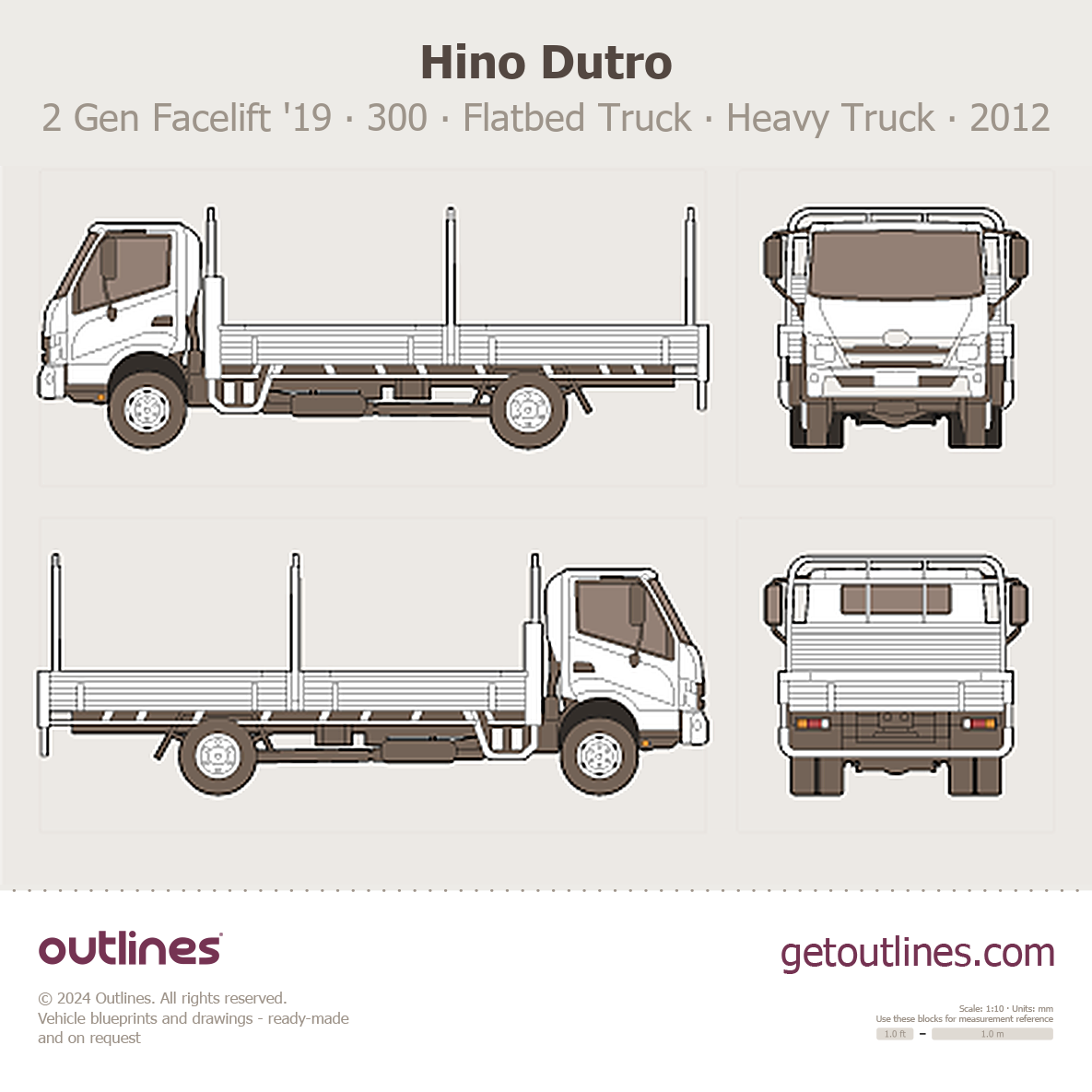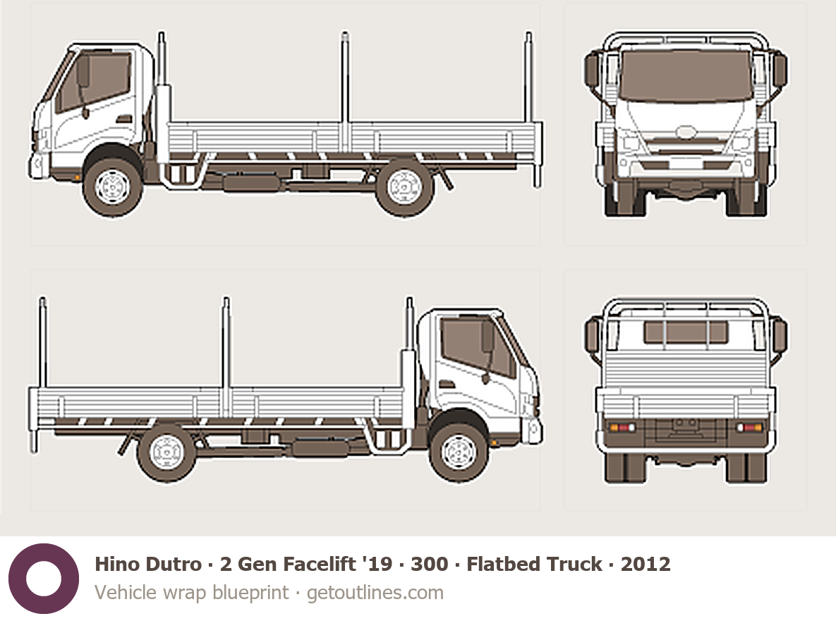 This 2012 Hino Dutro 2 Gen Facelift '19 300 ∙ Flatbed Truck Heavy Truck blueprint helps designers, wrap studios, and 3D artists simplify their workflow and save valuable time for creative work instead of routine tasks.