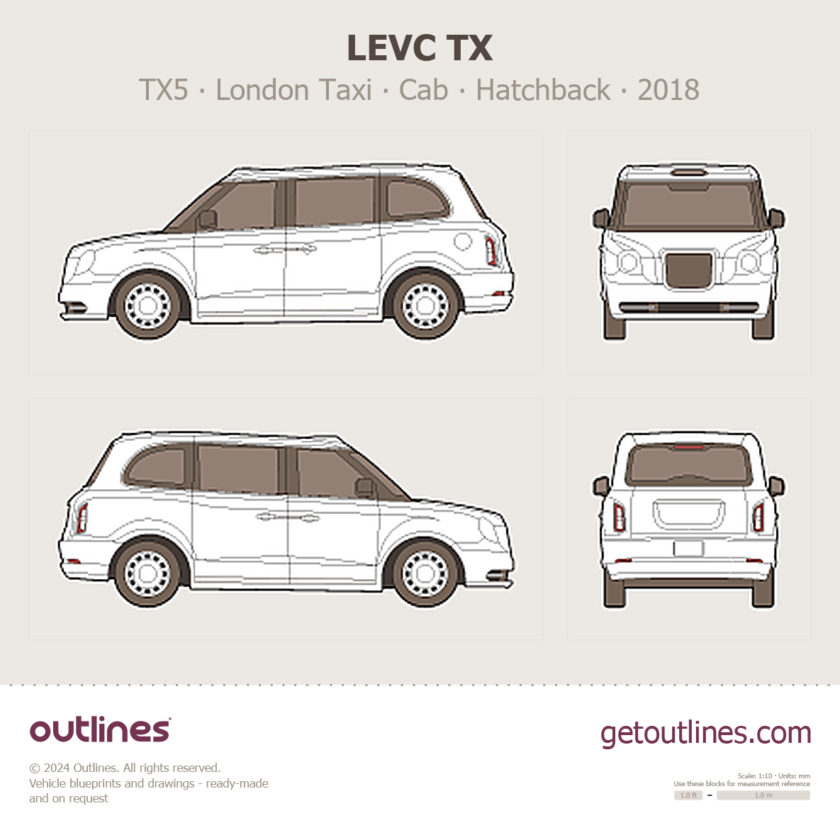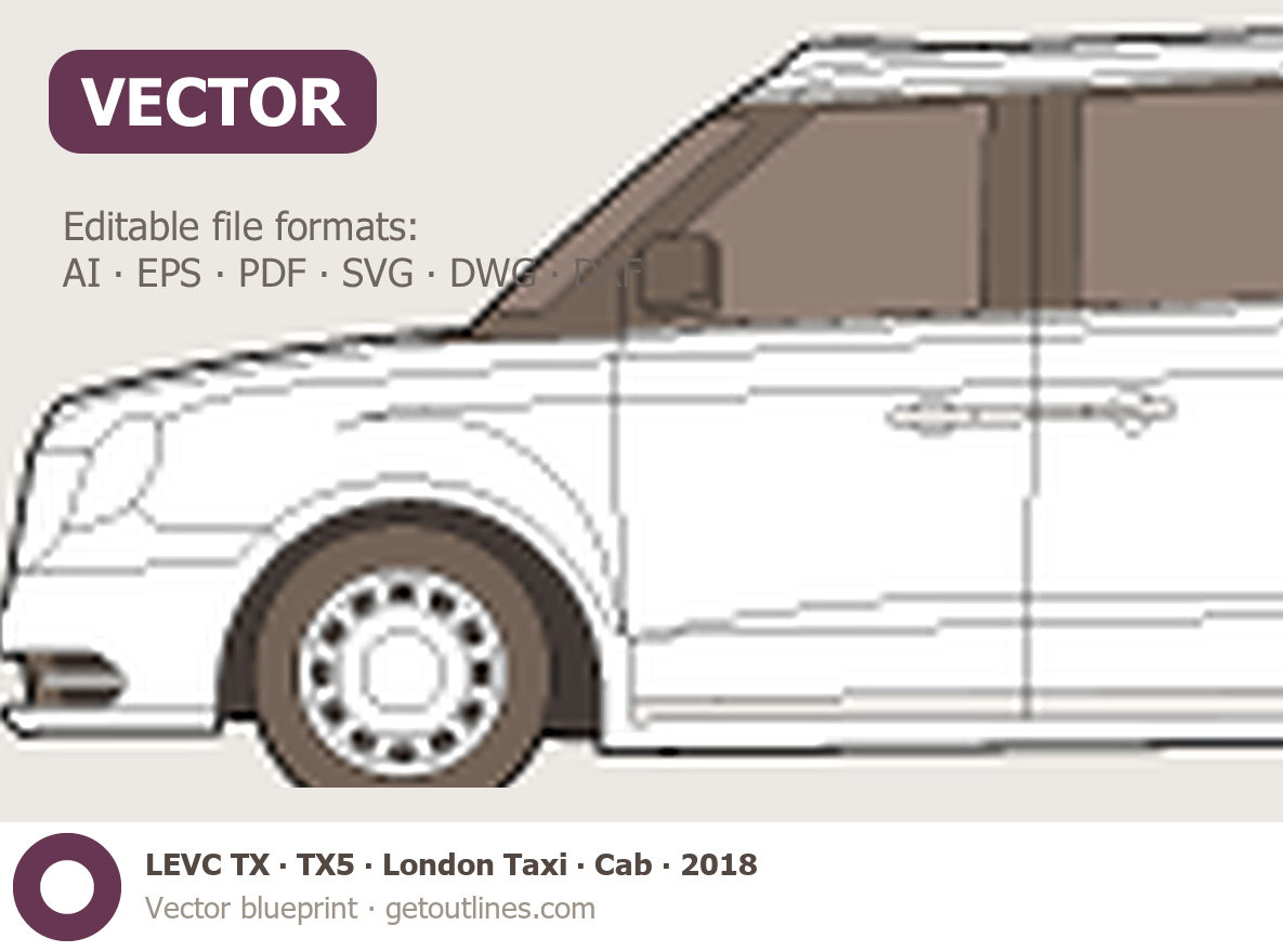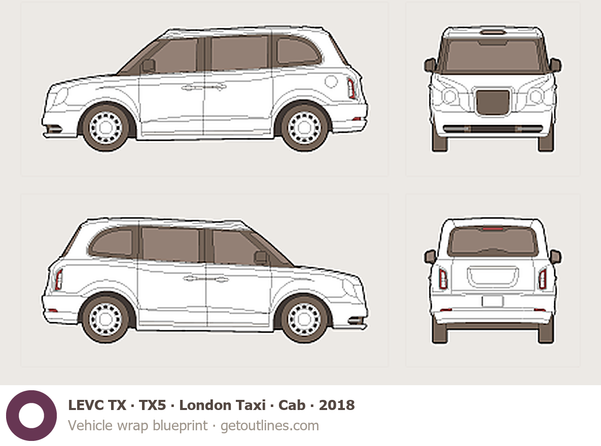 This 2018 LEVC TX TX5 ∙ London Taxi ∙ Cab Hatchback blueprint helps designers, wrap studios, and 3D artists simplify their workflow and save valuable time for creative work instead of routine tasks.