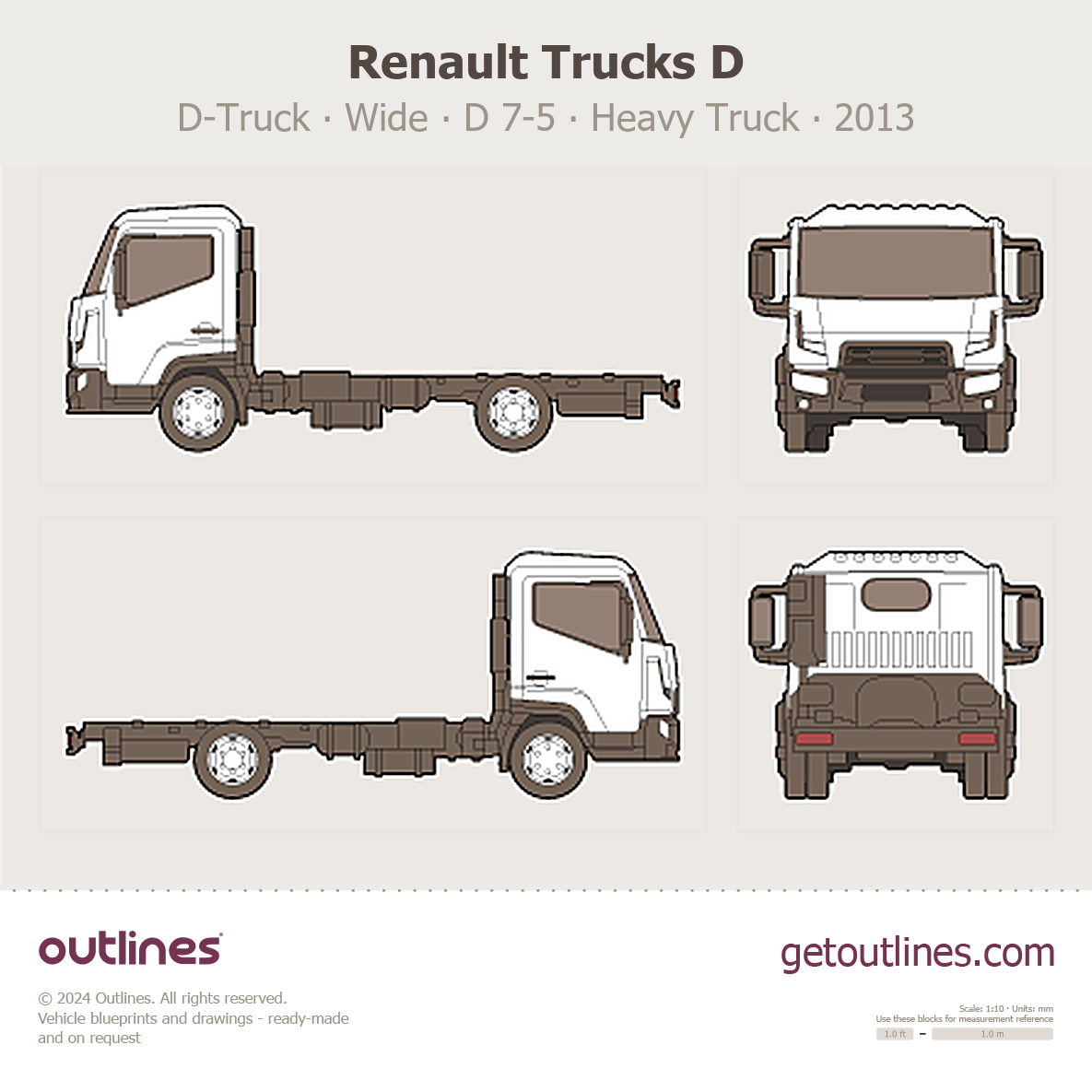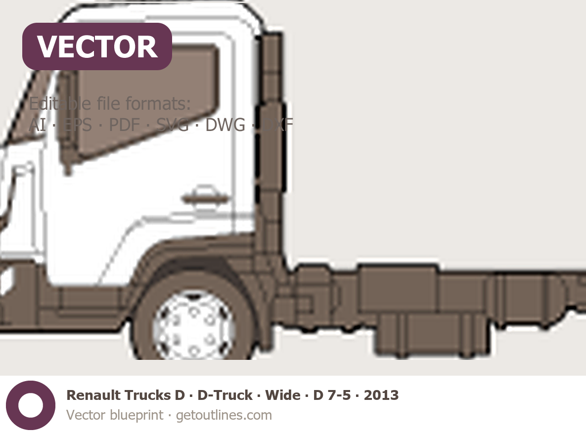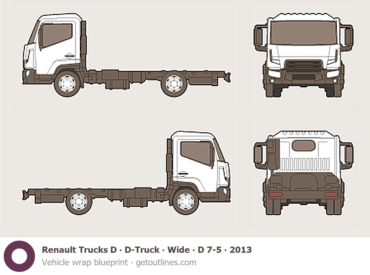 This 2013 Renault Trucks D D-Truck ∙ Wide ∙ D 7-5 Heavy Truck blueprint helps designers, wrap studios, and 3D artists simplify their workflow and save valuable time for creative work instead of routine tasks.