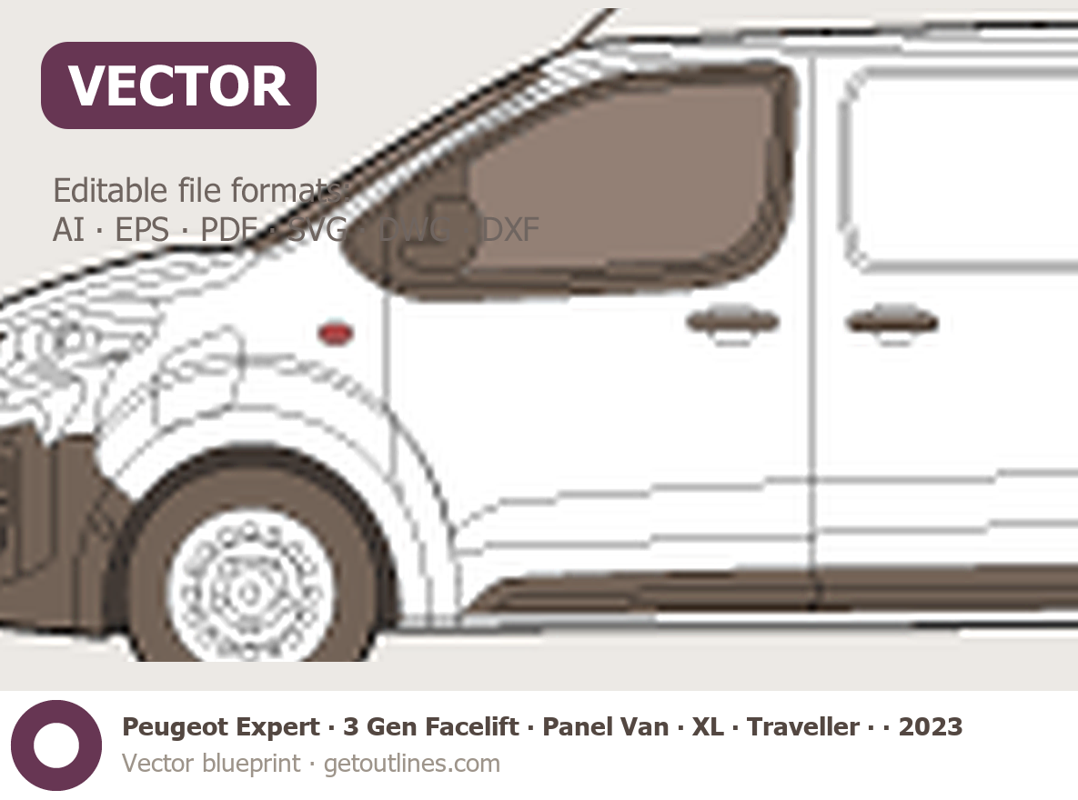 Buy this Peugeot Expert 3 Gen Facelift blueprint and line drawing in high-quality editable vector file formats. Best for 3D and car wrap design.