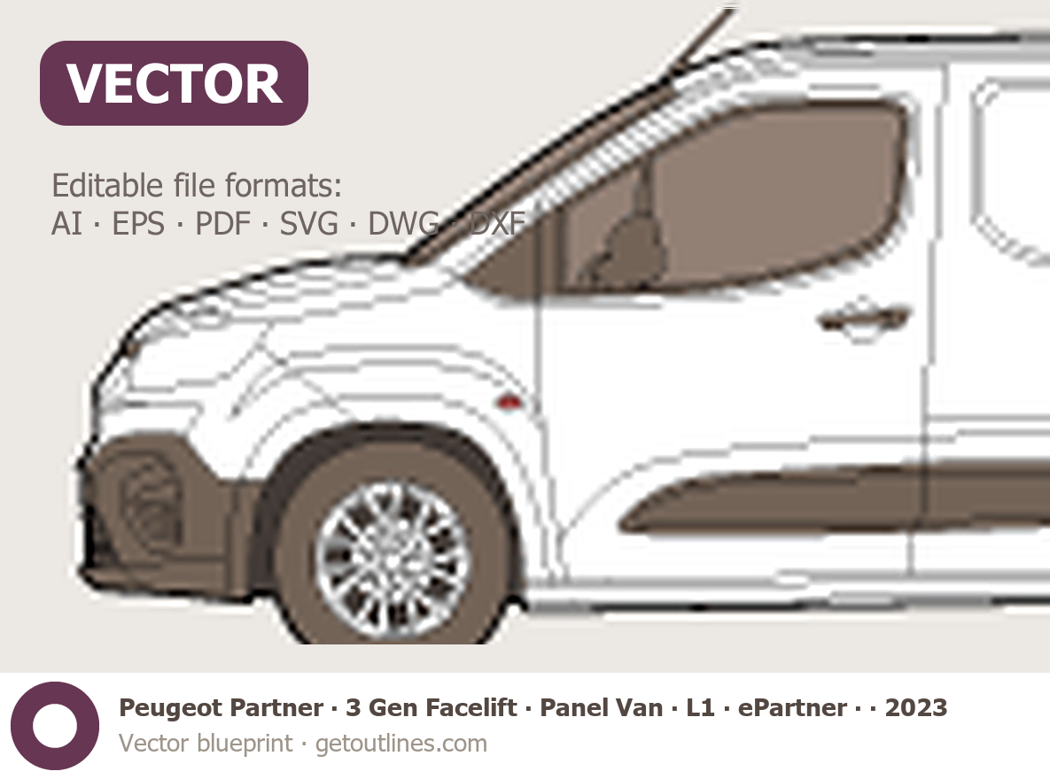 Buy this Peugeot Partner 3 Gen Facelift blueprint and line drawing in high-quality editable vector file formats. Best for 3D and car wrap design.