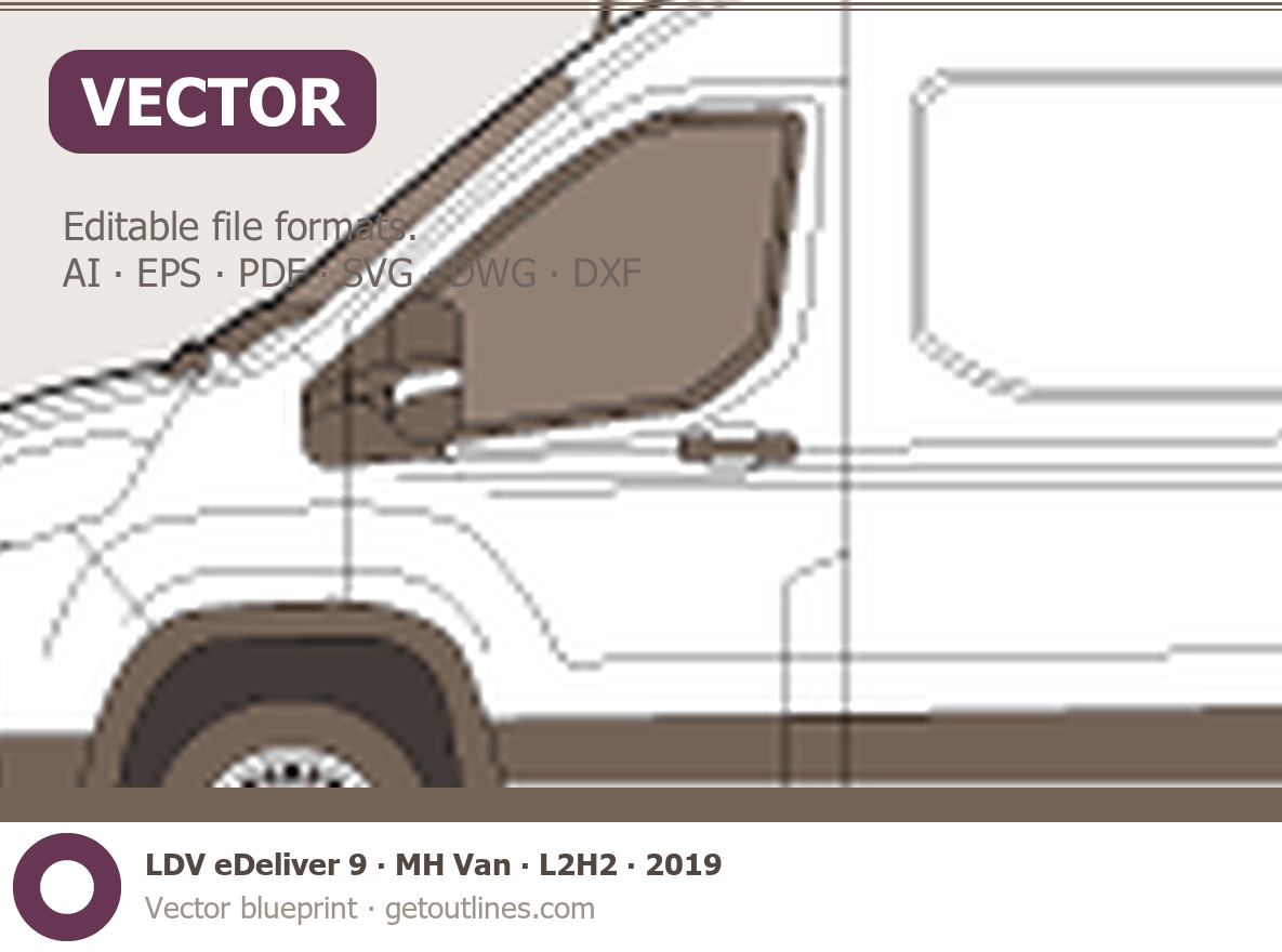 This 2019 LDV eDeliver 9 MH Van ∙ L2H2 Van blueprint helps designers, wrap studios, and 3D artists simplify their workflow and save valuable time for creative work instead of routine tasks.