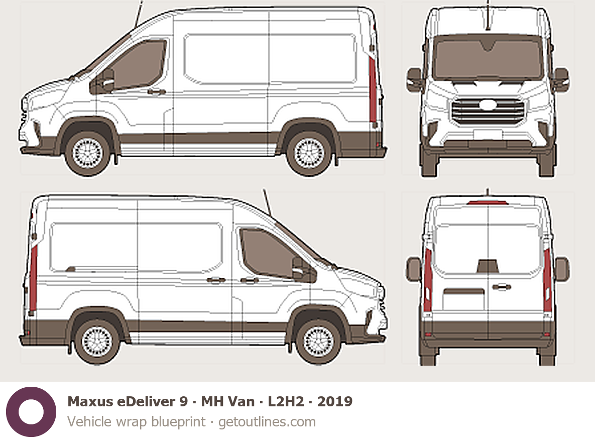 This 2019 Maxus eDeliver 9 MH Van ∙ L2H2 Van blueprint helps designers, wrap studios, and 3D artists simplify their workflow and save valuable time for creative work instead of routine tasks.