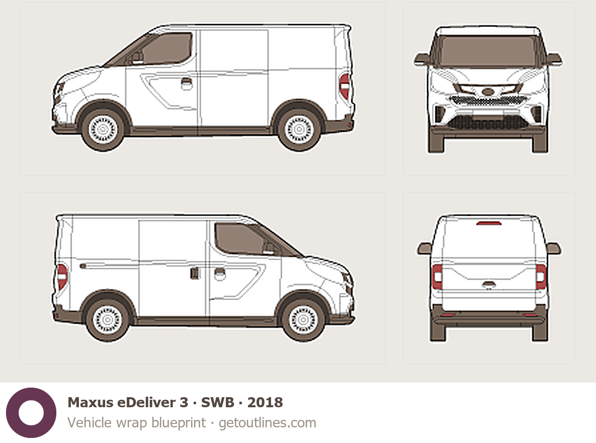 This 2018 Maxus eDeliver 3 SWB Van blueprint helps designers, wrap studios, and 3D artists simplify their workflow and save valuable time for creative work instead of routine tasks.