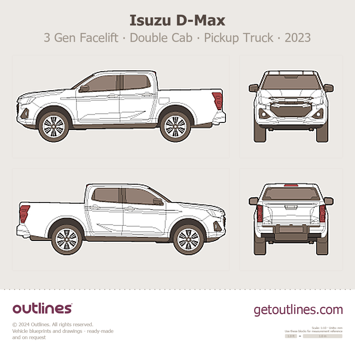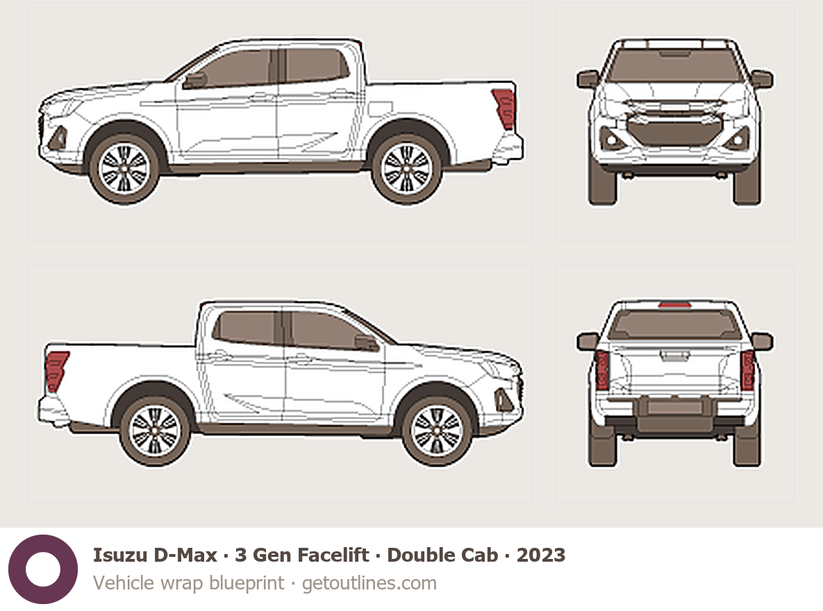 Buy this Isuzu D-Max 3 Gen Facelift blueprint and line drawing in high-quality editable vector file formats. Best for 3D and car wrap design.