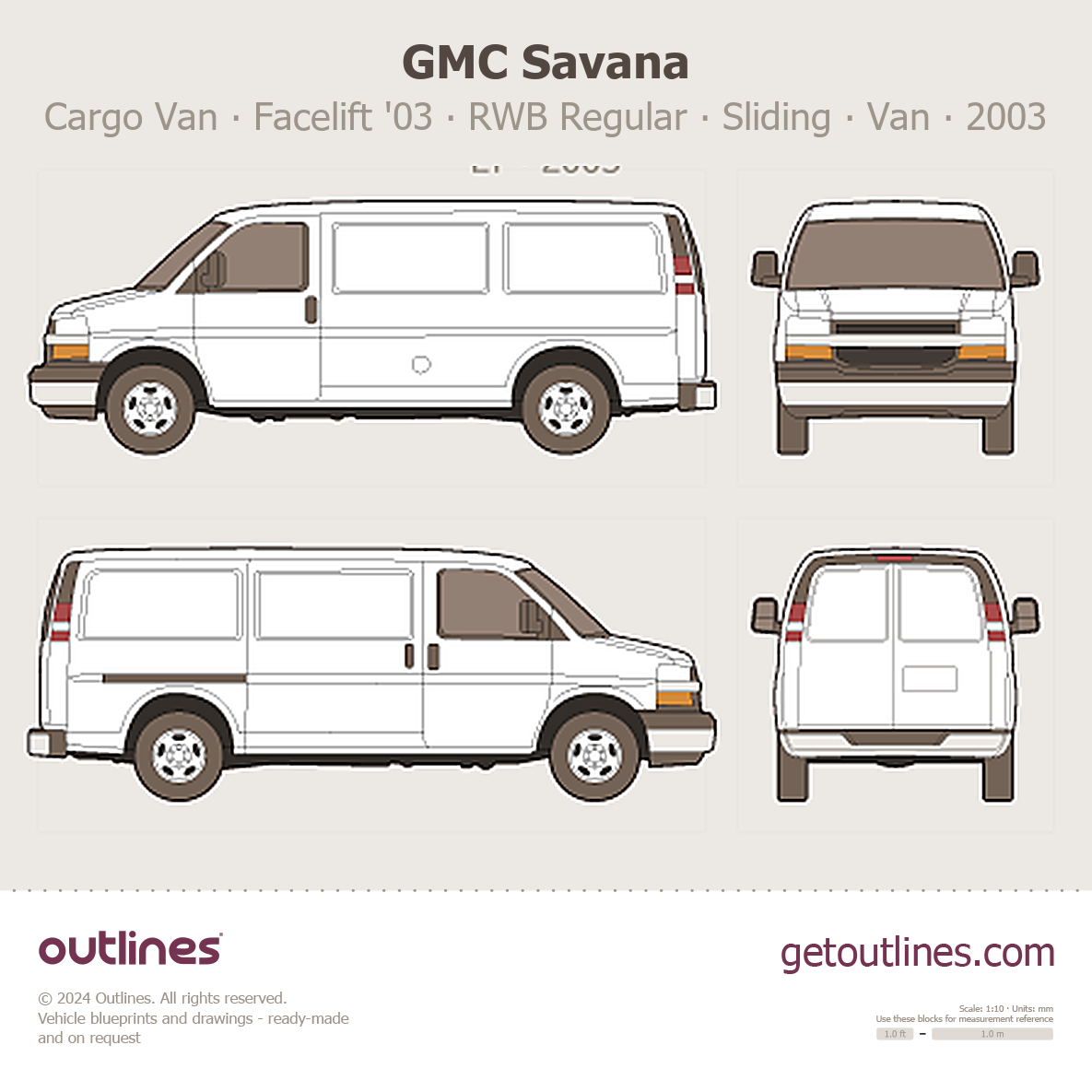 This 2003 GMC Savana Cargo Van ∙ Facelift '03 RWB Regular ∙ Sliding Door ∙ LT Van blueprint helps designers, wrap studios, and 3D artists simplify their workflow and save valuable time for creative work instead of routine tasks.