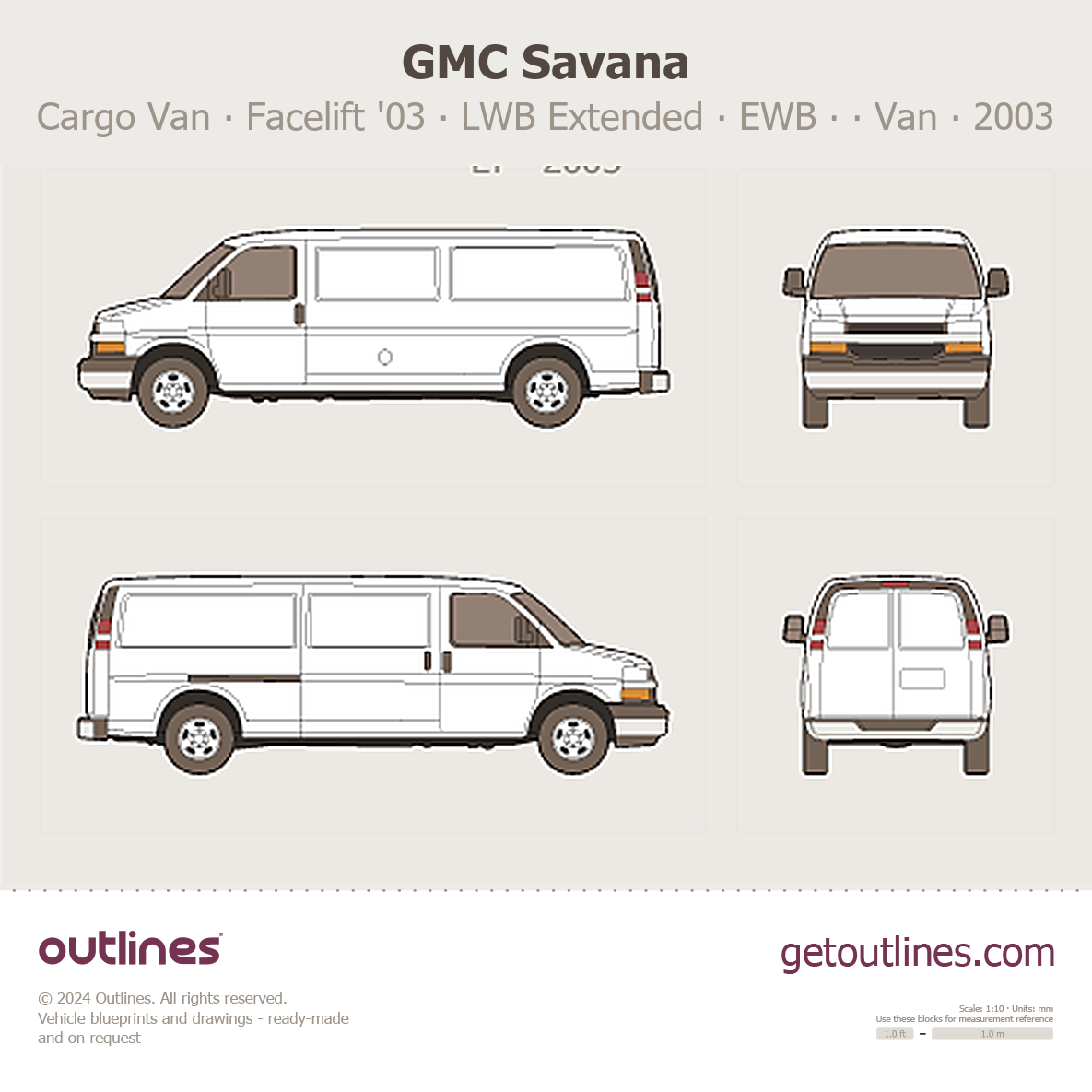 This 2003 GMC Savana Cargo Van ∙ Facelift '03 LWB Extended ∙ EWB ∙ Sliding Door ∙ LT Van blueprint helps designers, wrap studios, and 3D artists simplify their workflow and save valuable time for creative work instead of routine tasks.