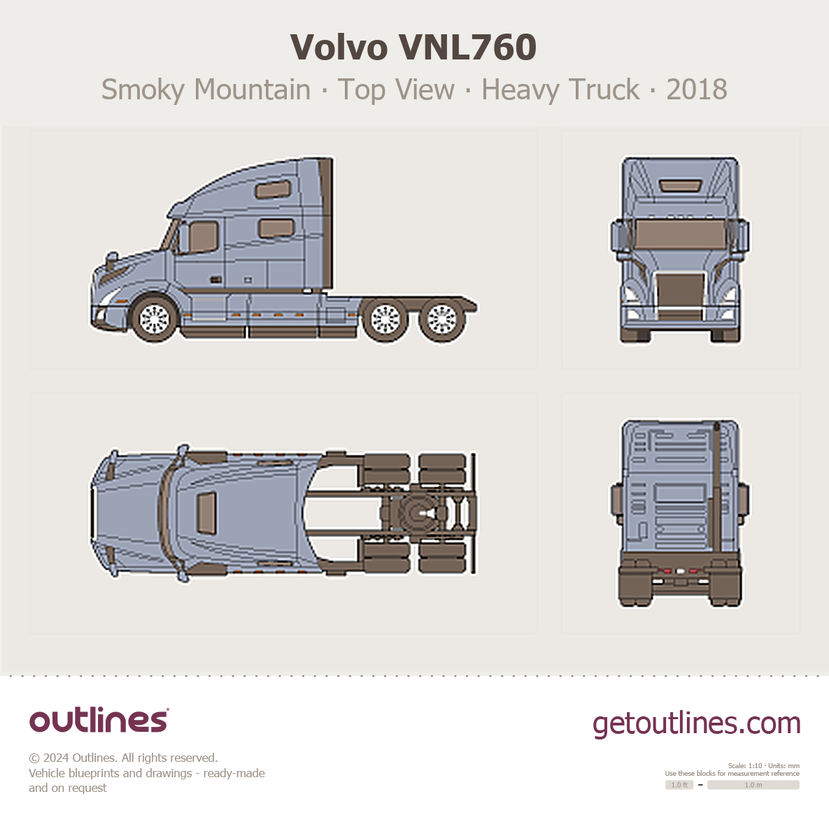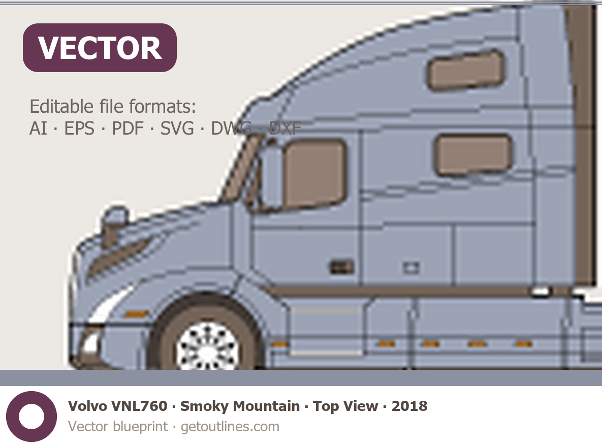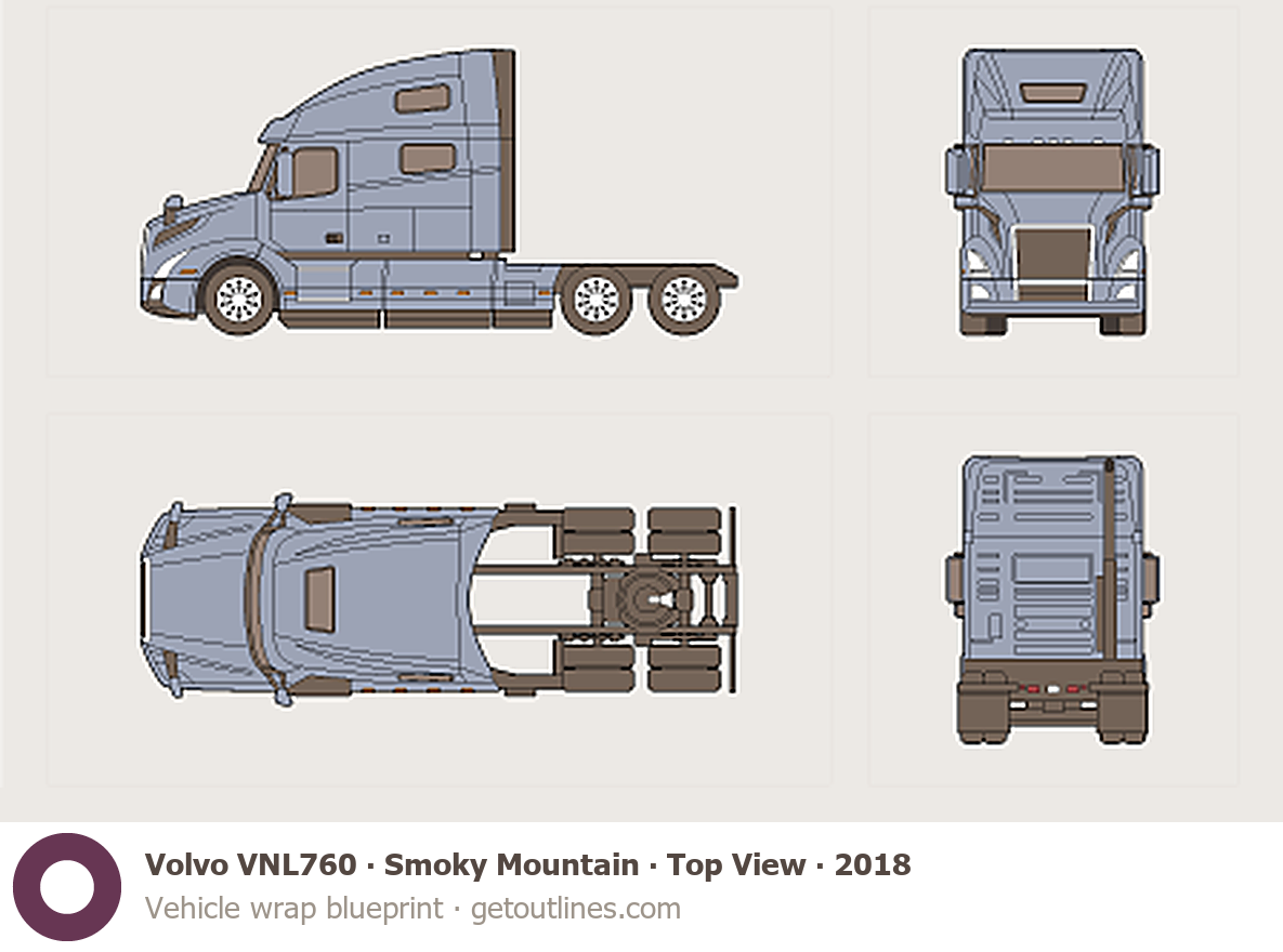 This 2018 Volvo VNL760 Smoky Mountain ∙ Top View Heavy Truck blueprint helps designers, wrap studios, and 3D artists simplify their workflow and save valuable time for creative work instead of routine tasks.