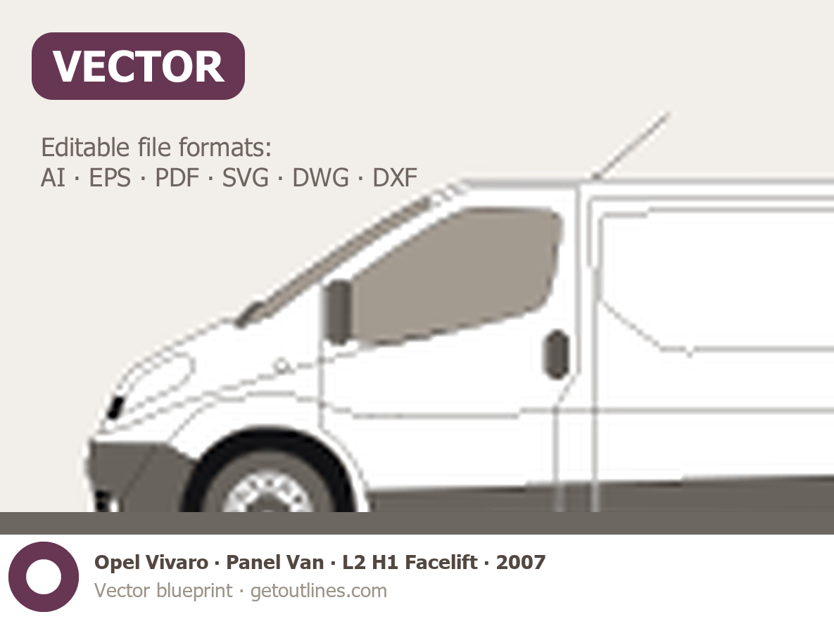 This 2007 Opel Vivaro Panel Van L2 H1 Facelift Wagon blueprint helps designers, wrap studios, and 3D artists simplify their workflow and save valuable time for creative work instead of routine tasks.