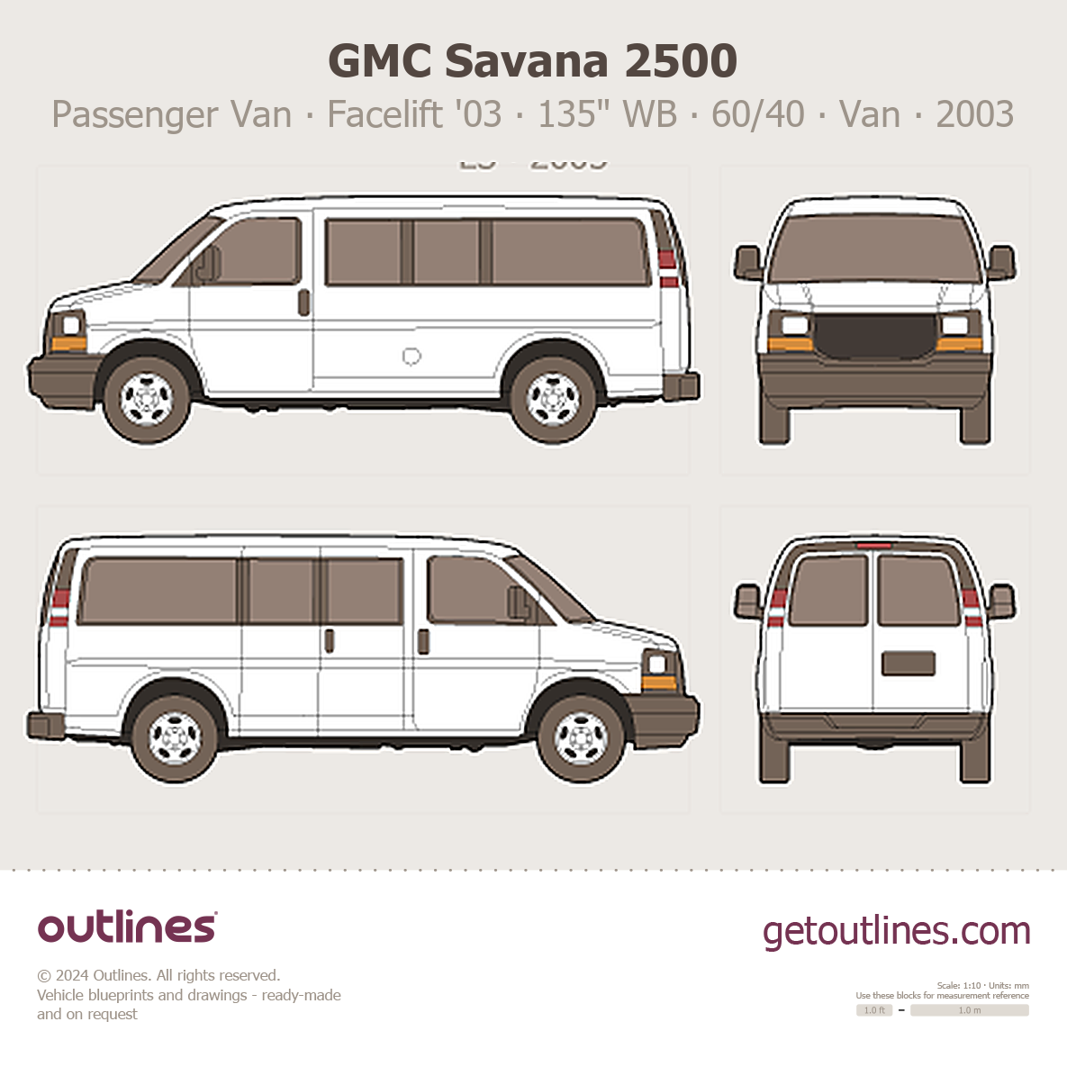 This 2003 GMC Savana 2500 Passenger Van ∙ Facelift '03 135" WB ∙ 60/40 Doors ∙ LS ∙ WT ∙ G2500 Van blueprint helps designers, wrap studios, and 3D artists simplify their workflow and save valuable time for creative work instead of routine tasks.