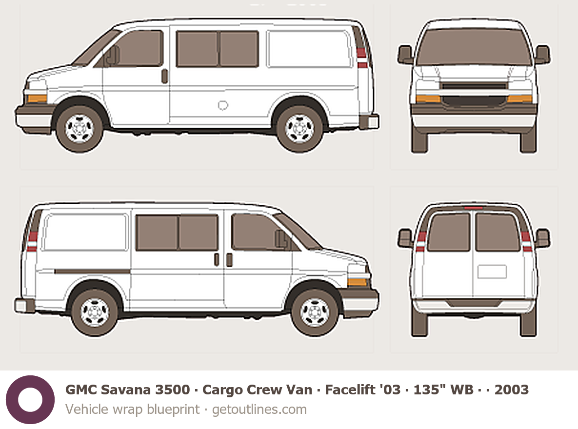 This 2003 GMC Savana 3500 Cargo Crew Van ∙ Facelift '03 135" WB ∙ 60/40 Doors ∙ LT ∙ 2nd-row seat option ∙ G3500 Van blueprint helps designers, wrap studios, and 3D artists simplify their workflow and save valuable time for creative work instead of routine tasks.