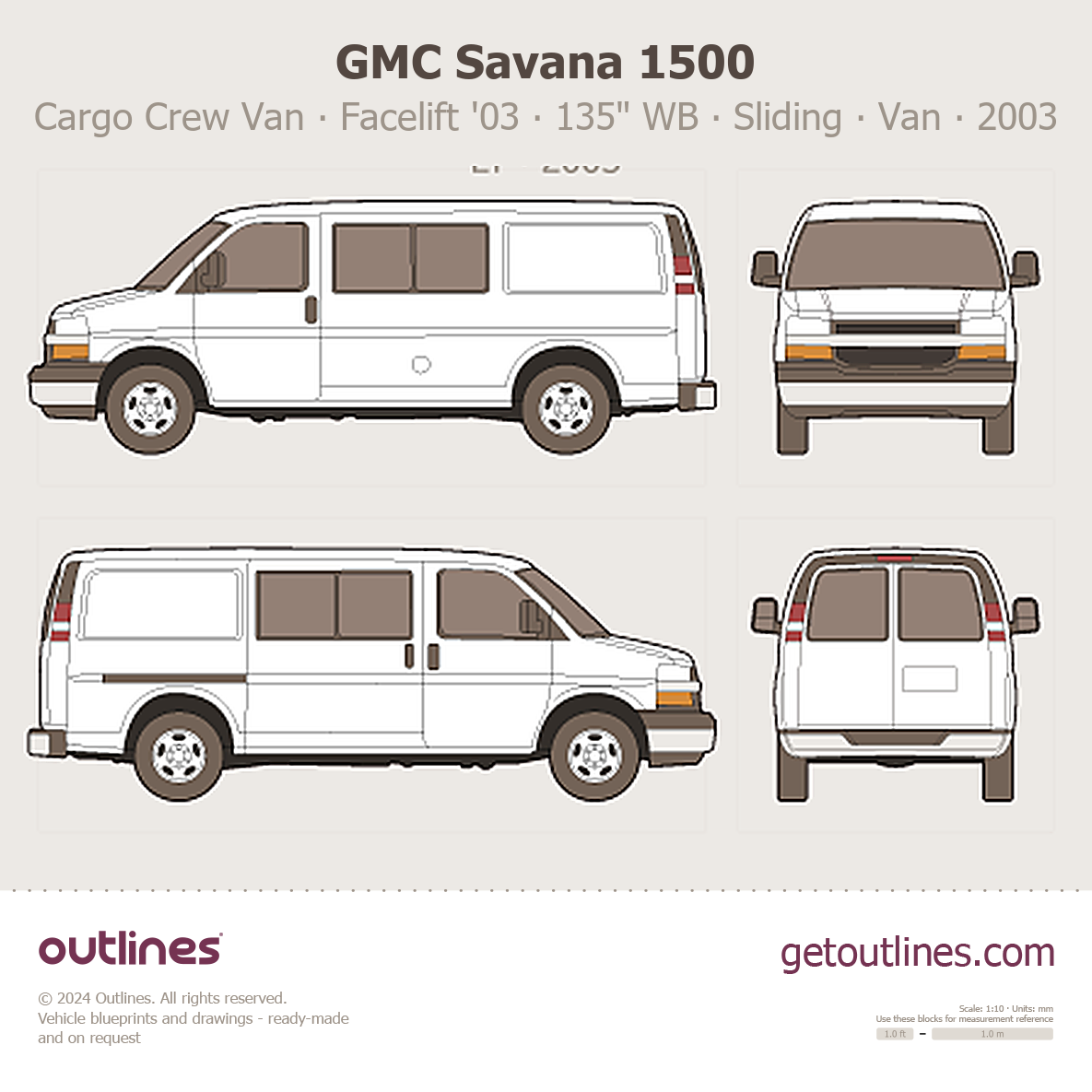 This 2003 GMC Savana 1500 Cargo Crew Van ∙ Facelift '03 135" WB ∙ Sliding Door ∙ LT ∙ 2nd-row seat option ∙ G1500 Van blueprint helps designers, wrap studios, and 3D artists simplify their workflow and save valuable time for creative work instead of routine tasks.