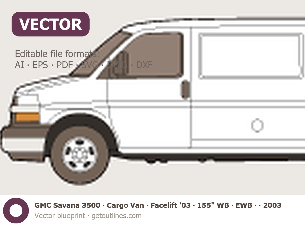 This 2003 GMC Savana 3500 Cargo Van ∙ Facelift '03 155" WB ∙ EWB ∙ 60/40 Doors ∙ LT ∙ G3500 Van blueprint helps designers, wrap studios, and 3D artists simplify their workflow and save valuable time for creative work instead of routine tasks.