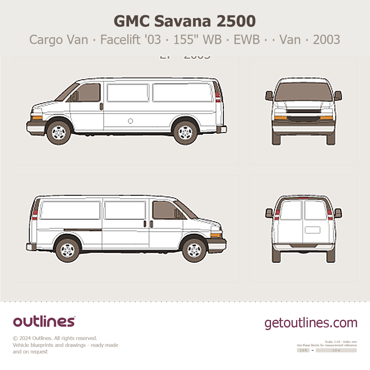 This 2003 GMC Savana 2500 Cargo Van ∙ Facelift '03 155" WB ∙ EWB ∙ Sliding Door ∙ LT ∙ G2500 Van blueprint helps designers, wrap studios, and 3D artists simplify their workflow and save valuable time for creative work instead of routine tasks.