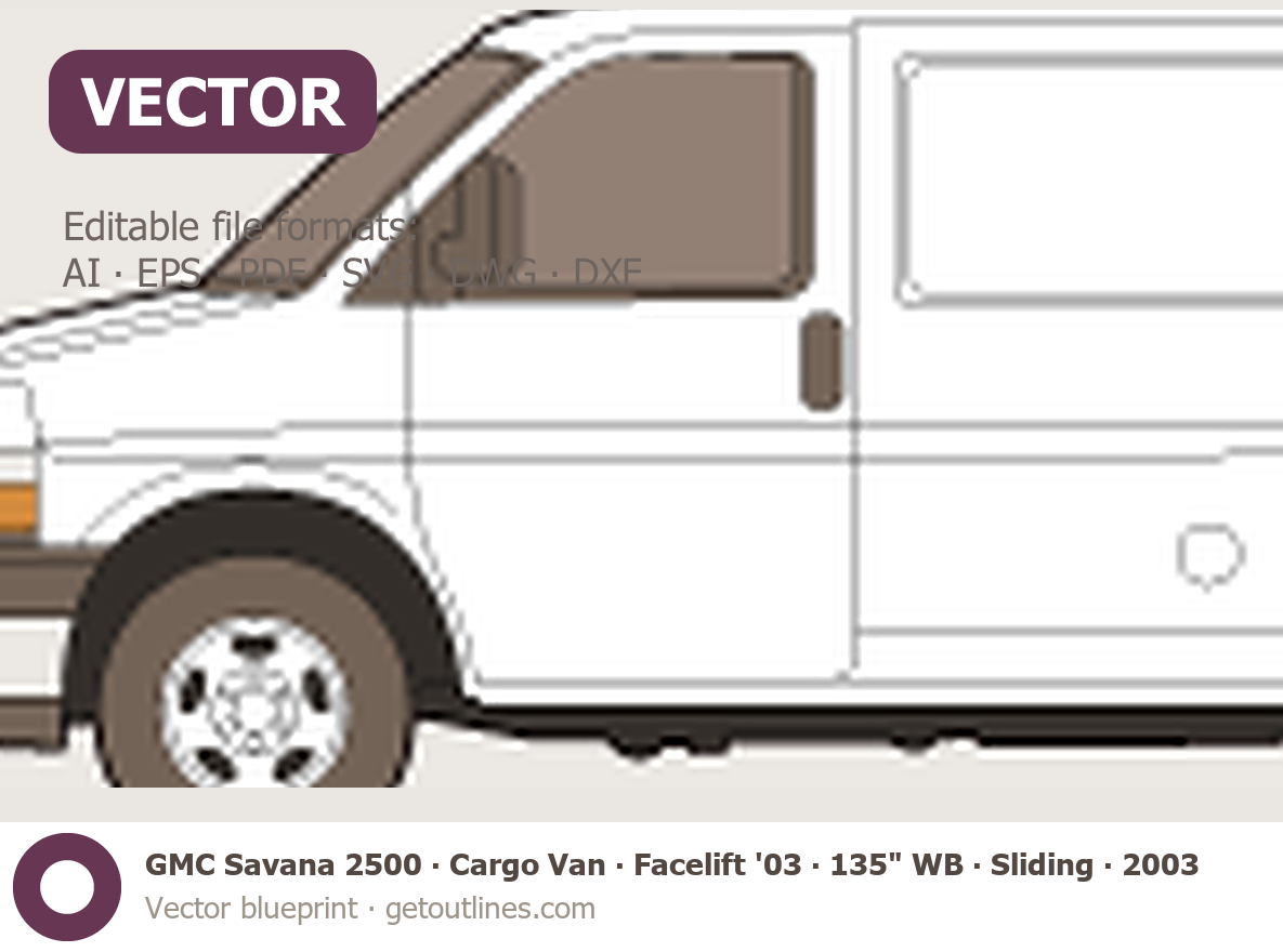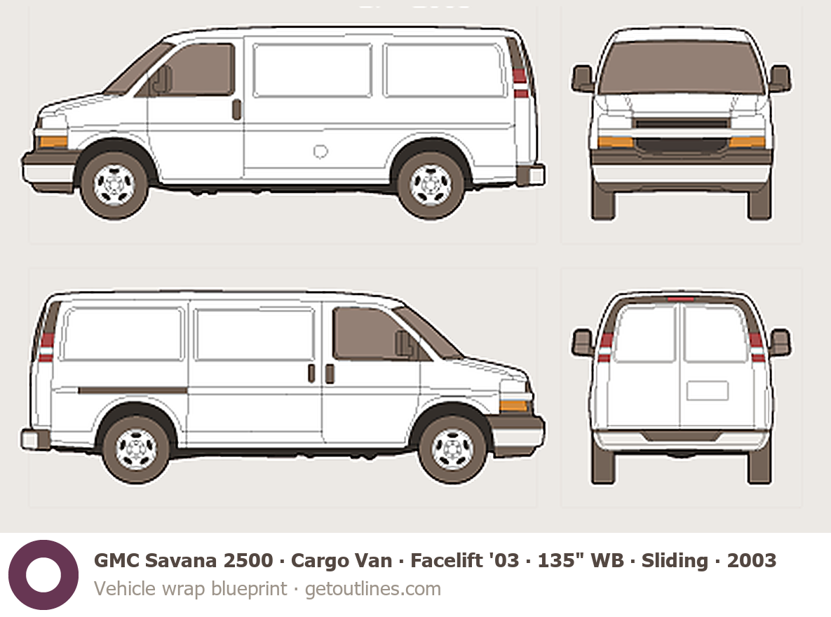 This 2003 GMC Savana 2500 Cargo Van ∙ Facelift '03 135" WB ∙ Sliding Door ∙ LT ∙ G2500 Van blueprint helps designers, wrap studios, and 3D artists simplify their workflow and save valuable time for creative work instead of routine tasks.