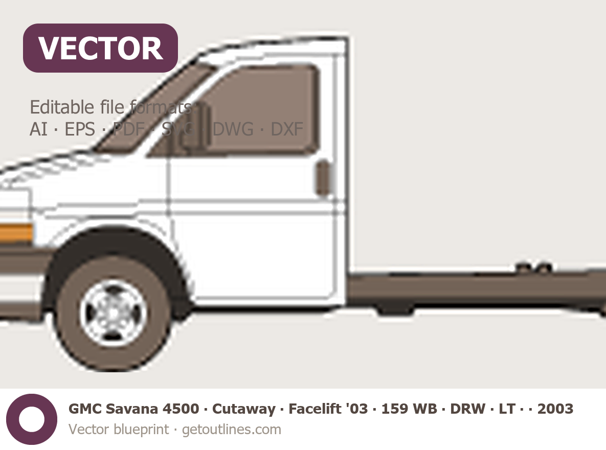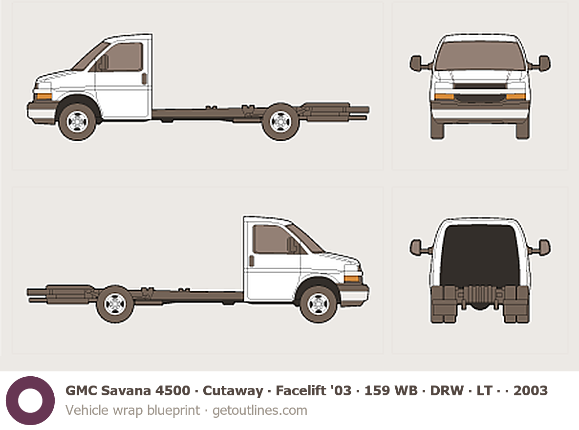 This 2003 GMC Savana 4500 Cutaway ∙ Facelift '03 159 WB ∙ DRW ∙ LT ∙ G4500 Heavy Truck blueprint helps designers, wrap studios, and 3D artists simplify their workflow and save valuable time for creative work instead of routine tasks.