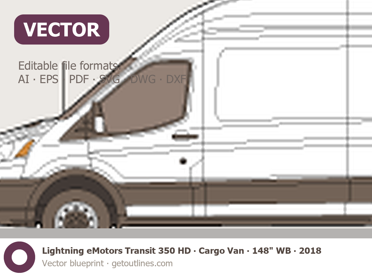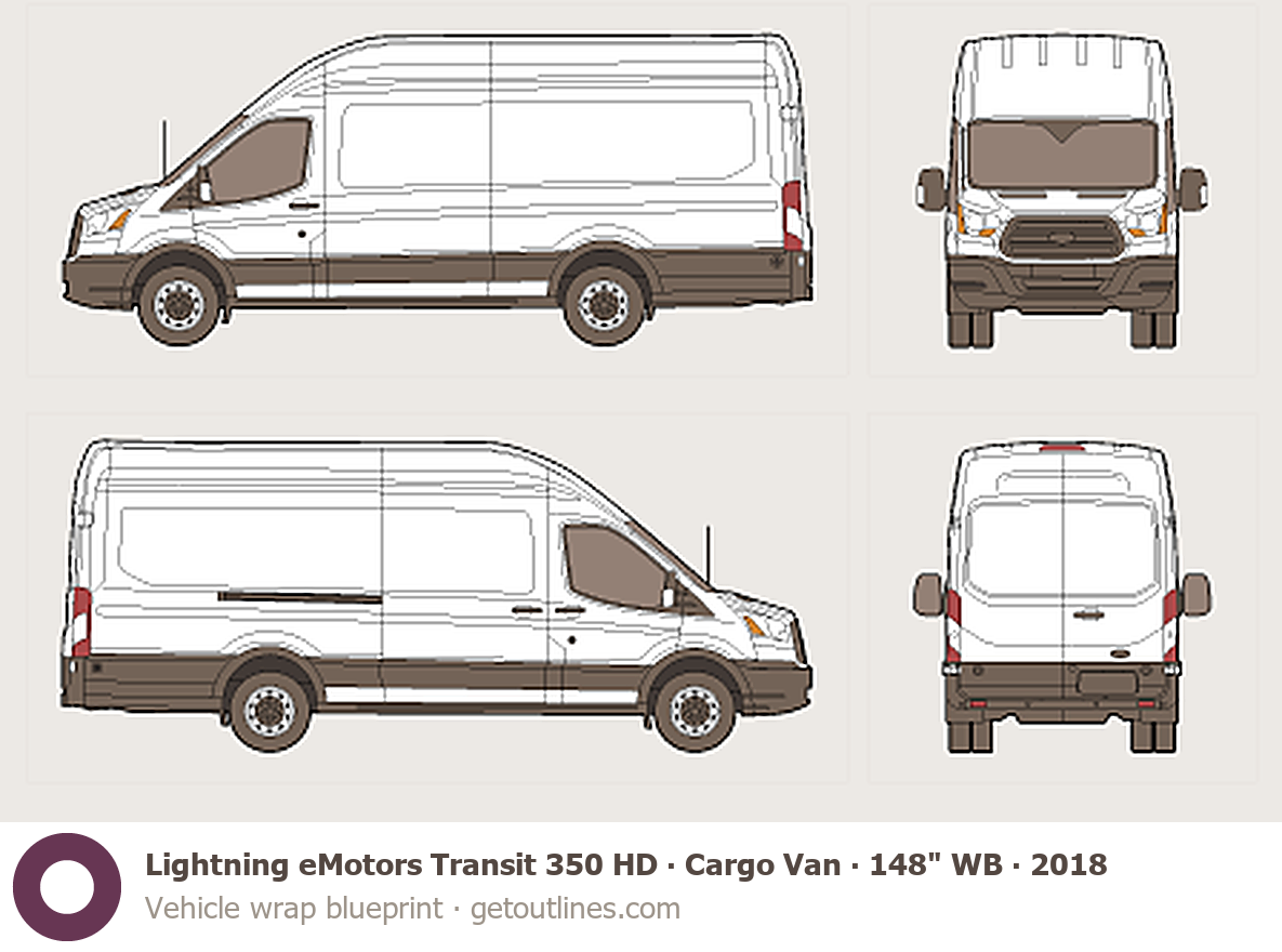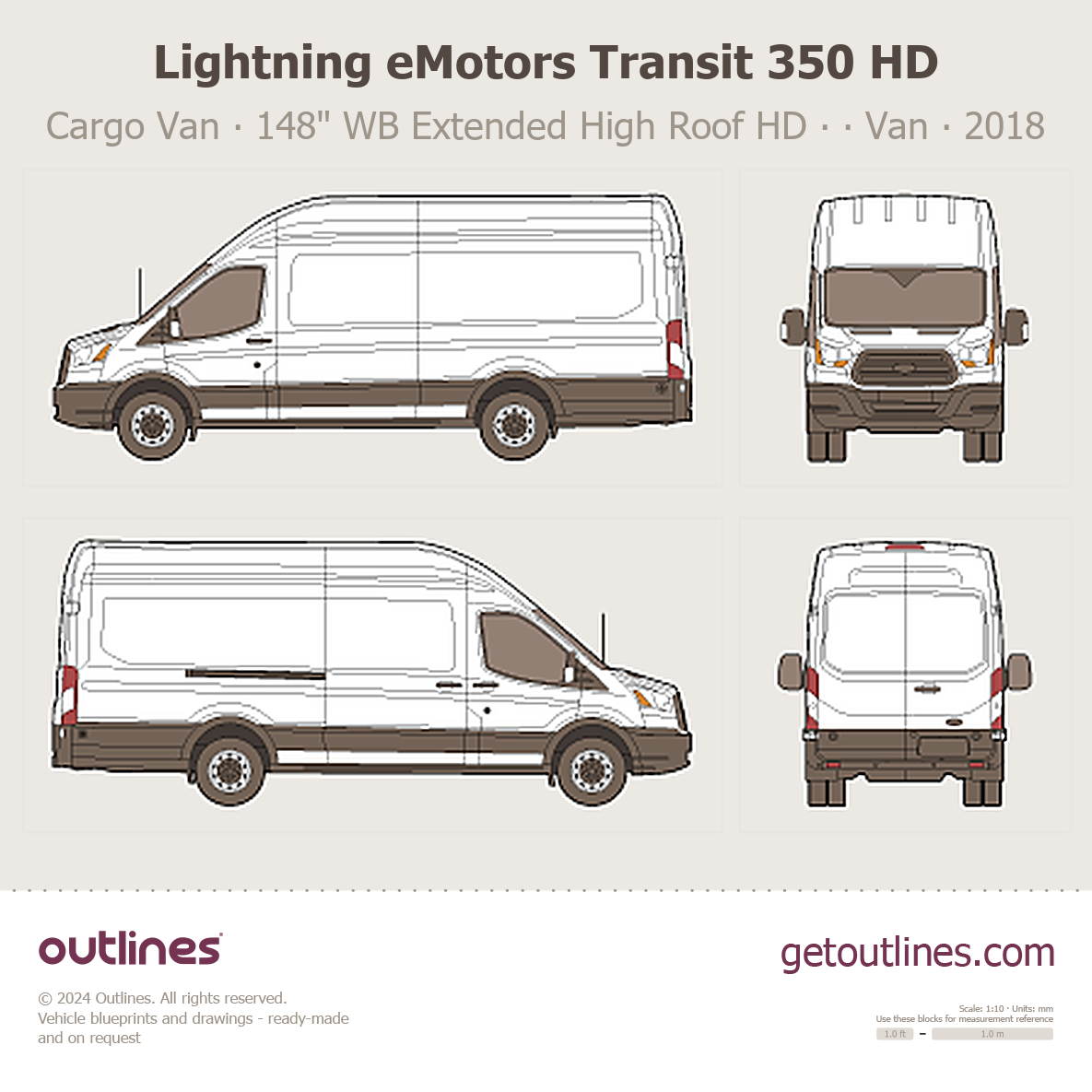 This 2018 Lightning eMotors Transit 350 HD Cargo Van 148" WB Extended High Roof HD ∙ DRW ∙ us ∙ T-350 HD Van blueprint helps designers, wrap studios, and 3D artists simplify their workflow and save valuable time for creative work instead of routine tasks.