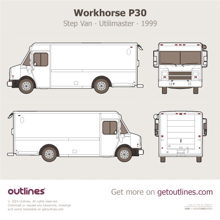 Buy this Workhorse P30 Step Van ∙ Utilimaster blueprint and line drawing in high-quality editable vector file formats. Best for 3D and car wrap design.