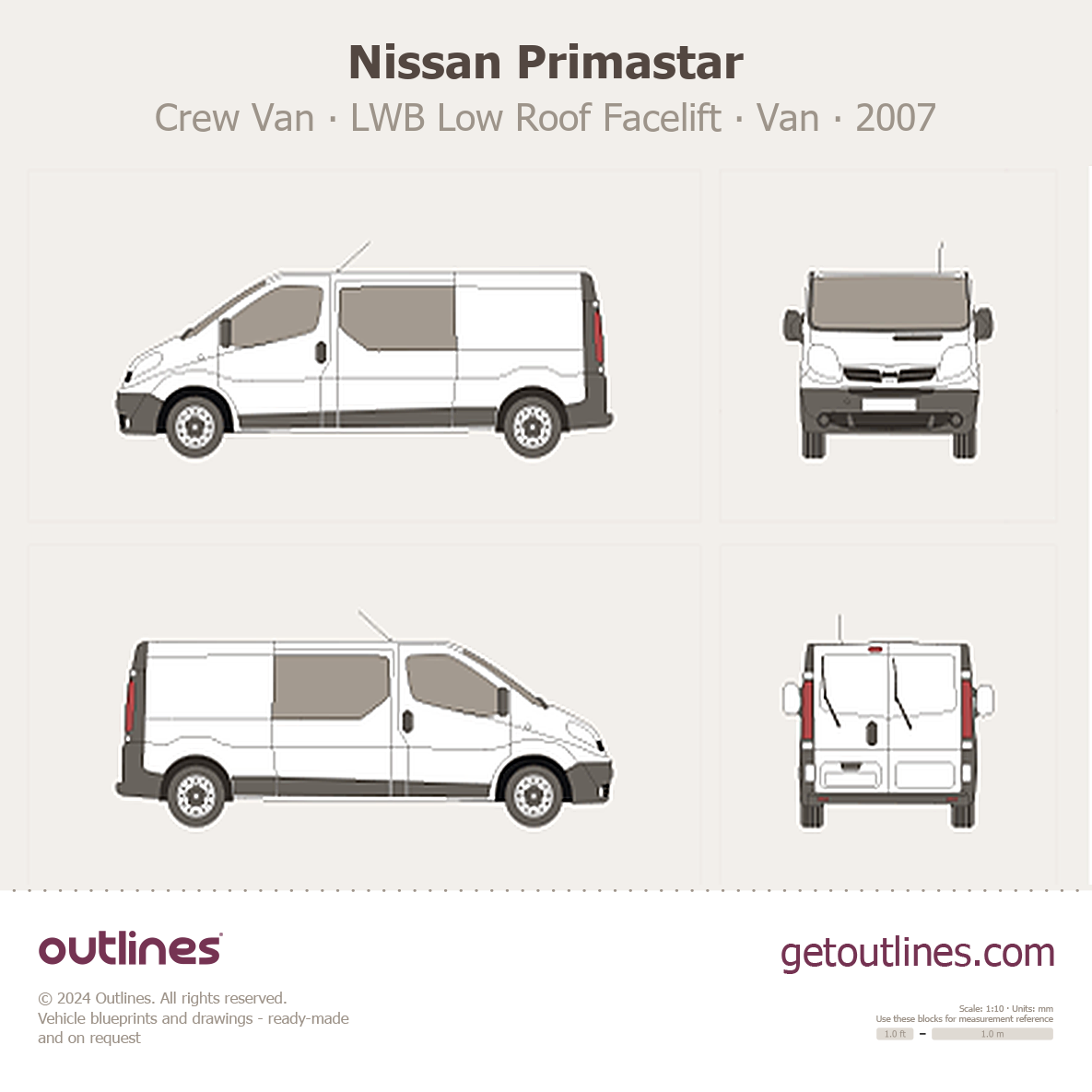 This 2007 Nissan Primastar Crew Van LWB Low Roof Facelift Van blueprint helps designers, wrap studios, and 3D artists simplify their workflow and save valuable time for creative work instead of routine tasks.