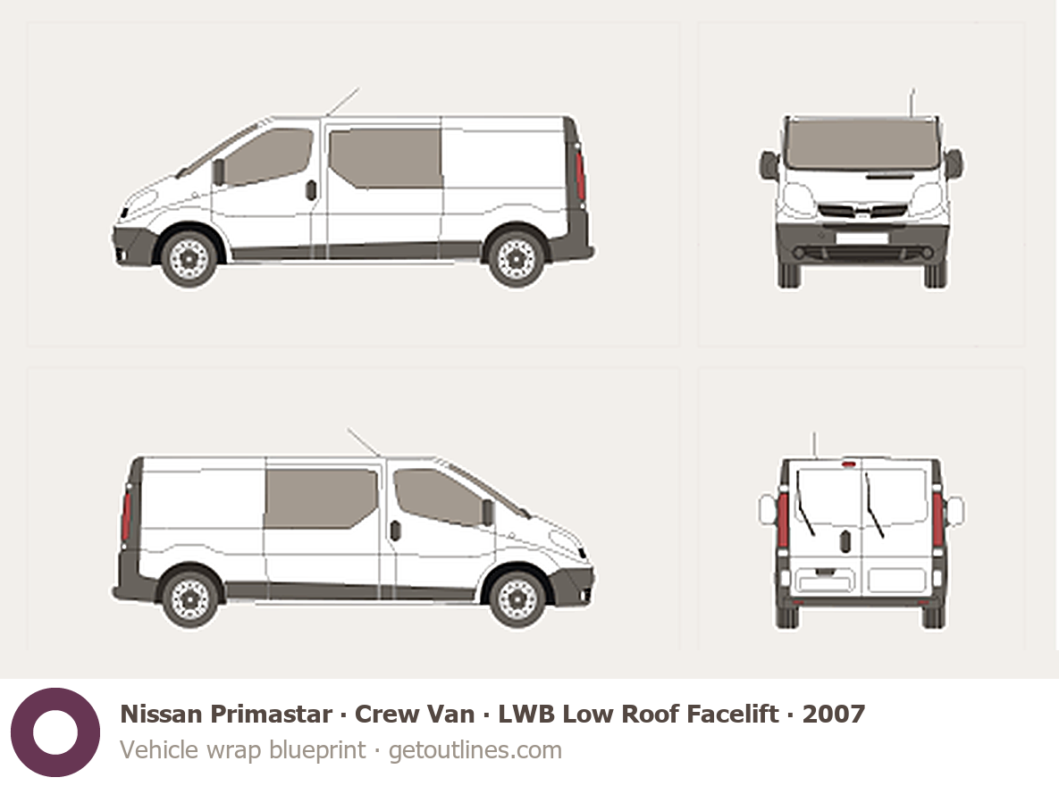 This 2007 Nissan Primastar Crew Van LWB Low Roof Facelift Van blueprint helps designers, wrap studios, and 3D artists simplify their workflow and save valuable time for creative work instead of routine tasks.