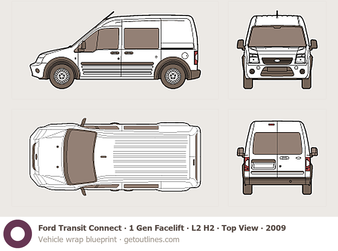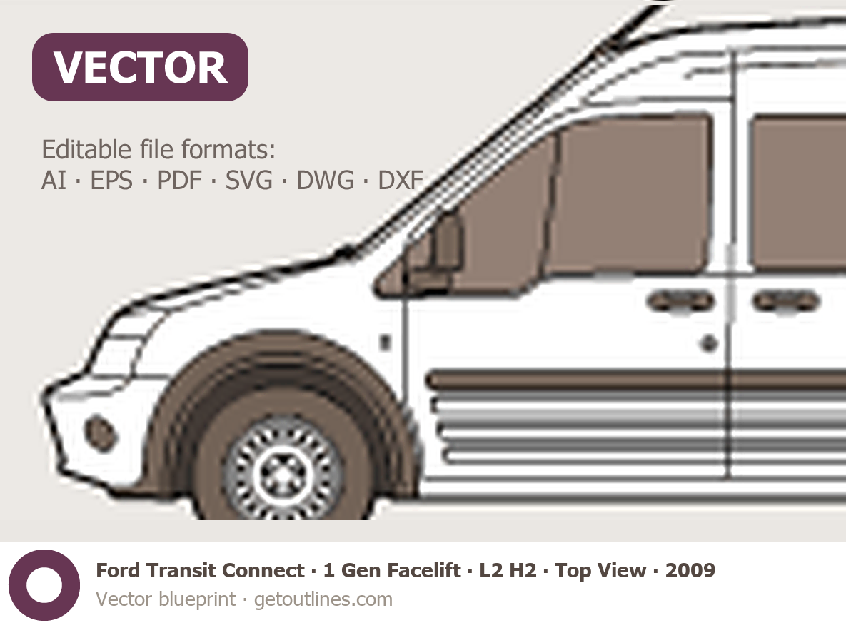 This 2009 Ford Transit Connect 1 Gen Facelift L2 H2 ∙ Top View Van blueprint helps designers, wrap studios, and 3D artists simplify their workflow and save valuable time for creative work instead of routine tasks.