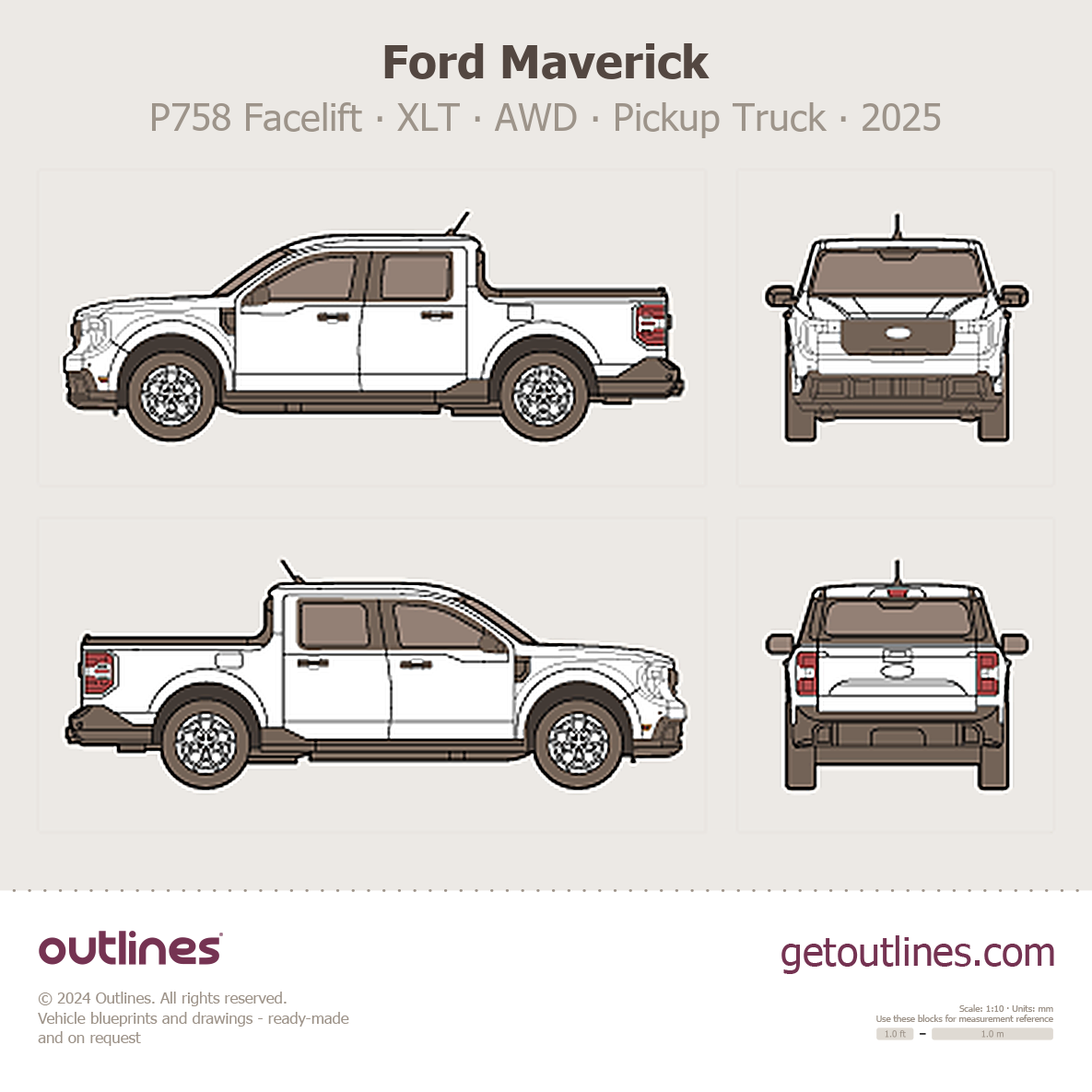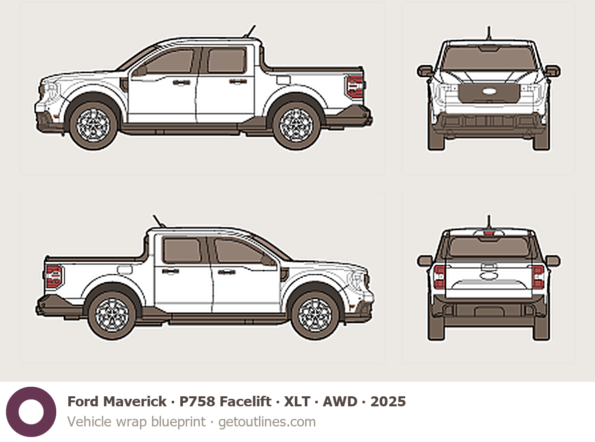 Buy this Ford Maverick P758 Facelift blueprint and line drawing in high-quality editable vector file formats. Best for 3D and car wrap design.