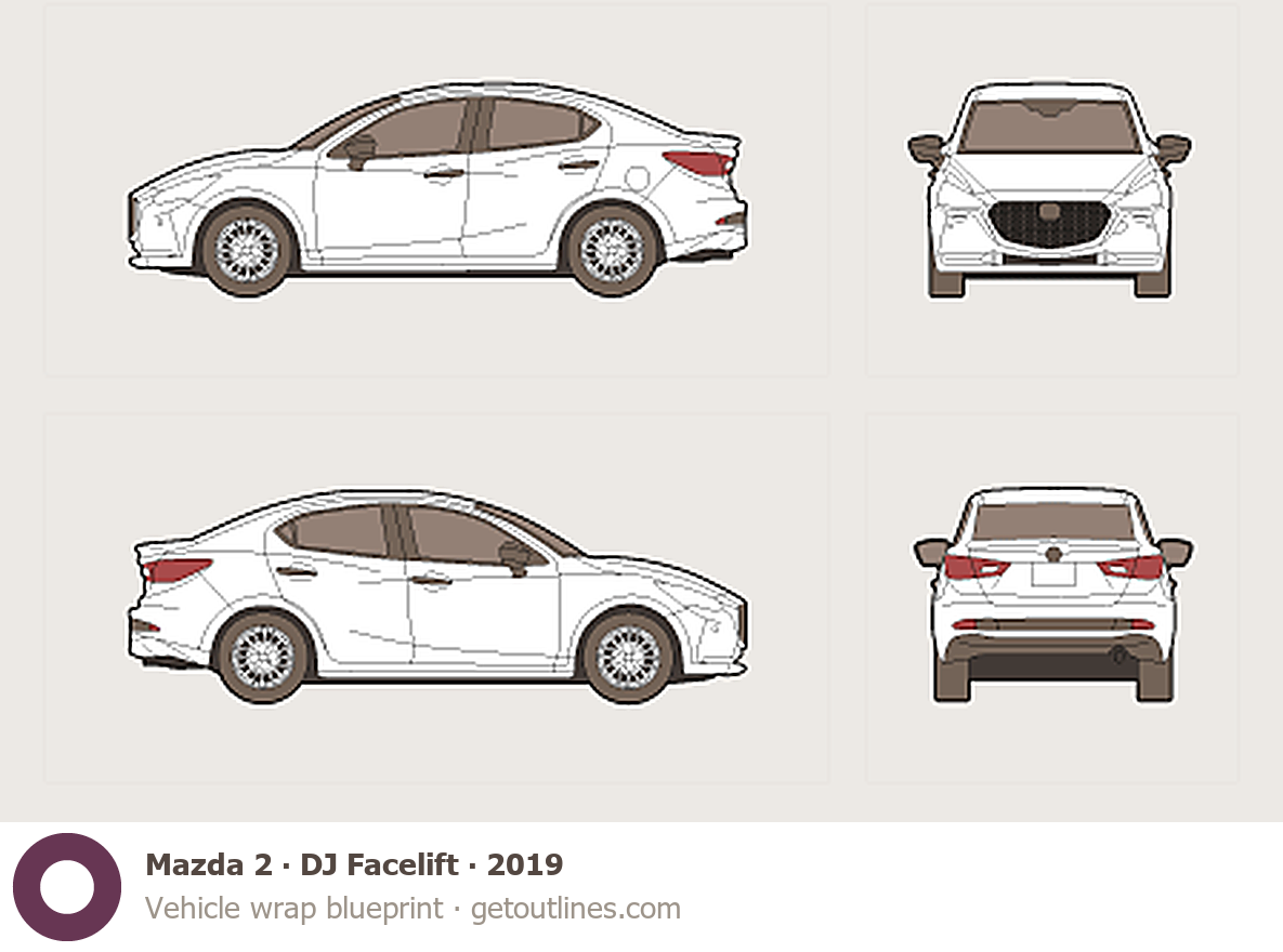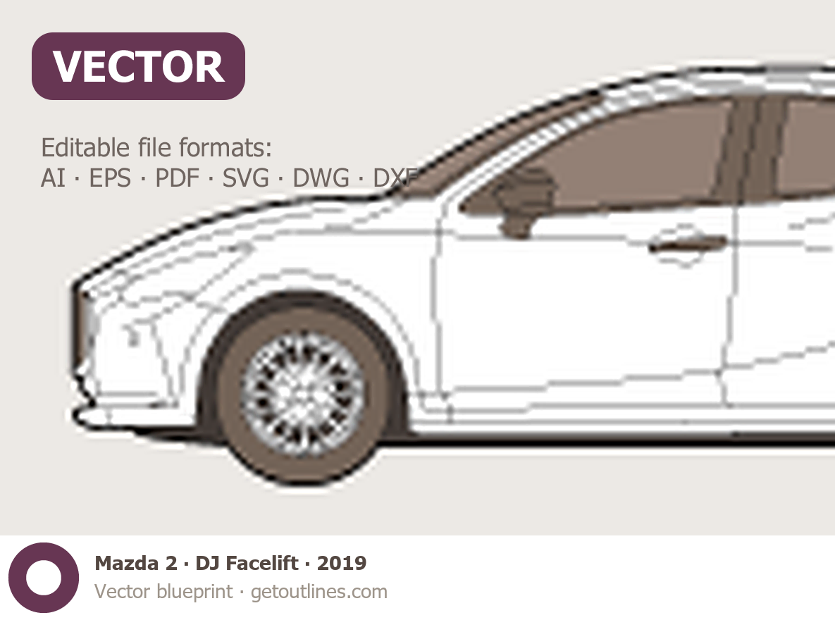 Buy this Mazda 2 DJ Facelift blueprint and line drawing in high-quality editable vector file formats. Best for 3D and car wrap design.