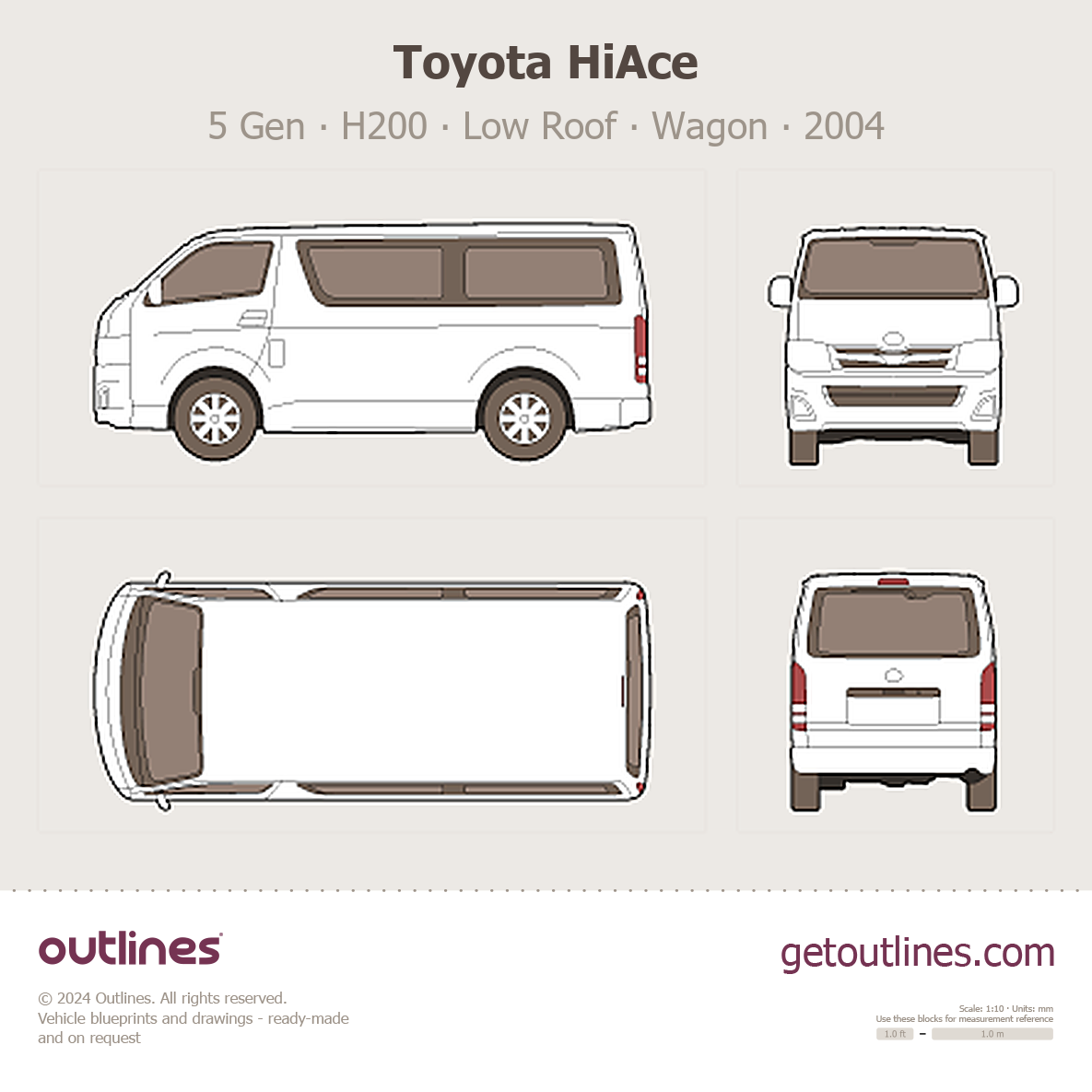 This is a blueprint of the HiAce, produced by carmaker Toyota in 2004 - 2010. It features a Wagon body design and is classified as a Commercial vehicle.
