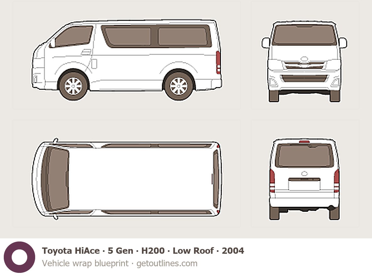 This 2004 Toyota HiAce 5 Gen ∙ H200 Low Roof Wagon blueprint helps designers, wrap studios, and 3D artists simplify their workflow and save valuable time for creative work instead of routine tasks.