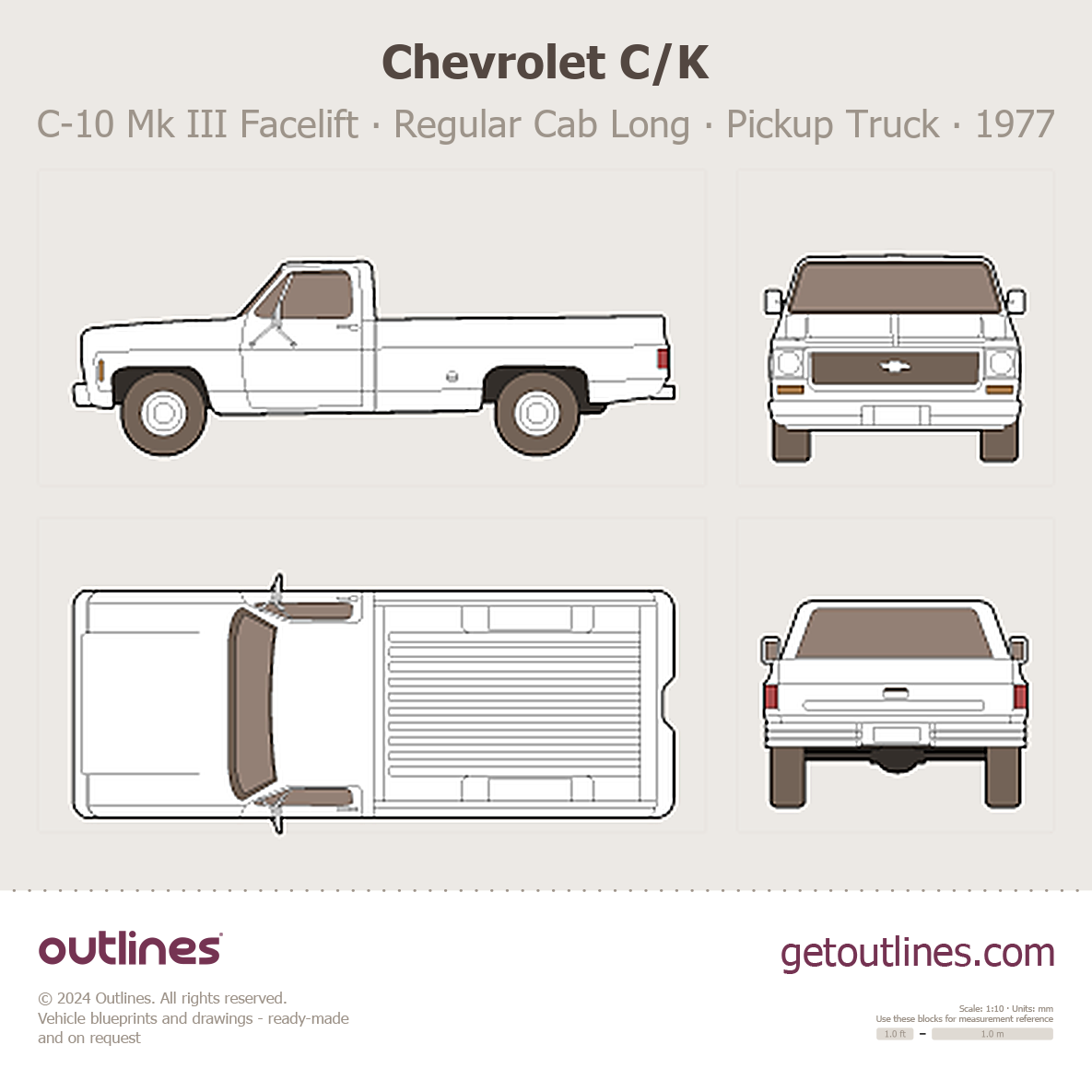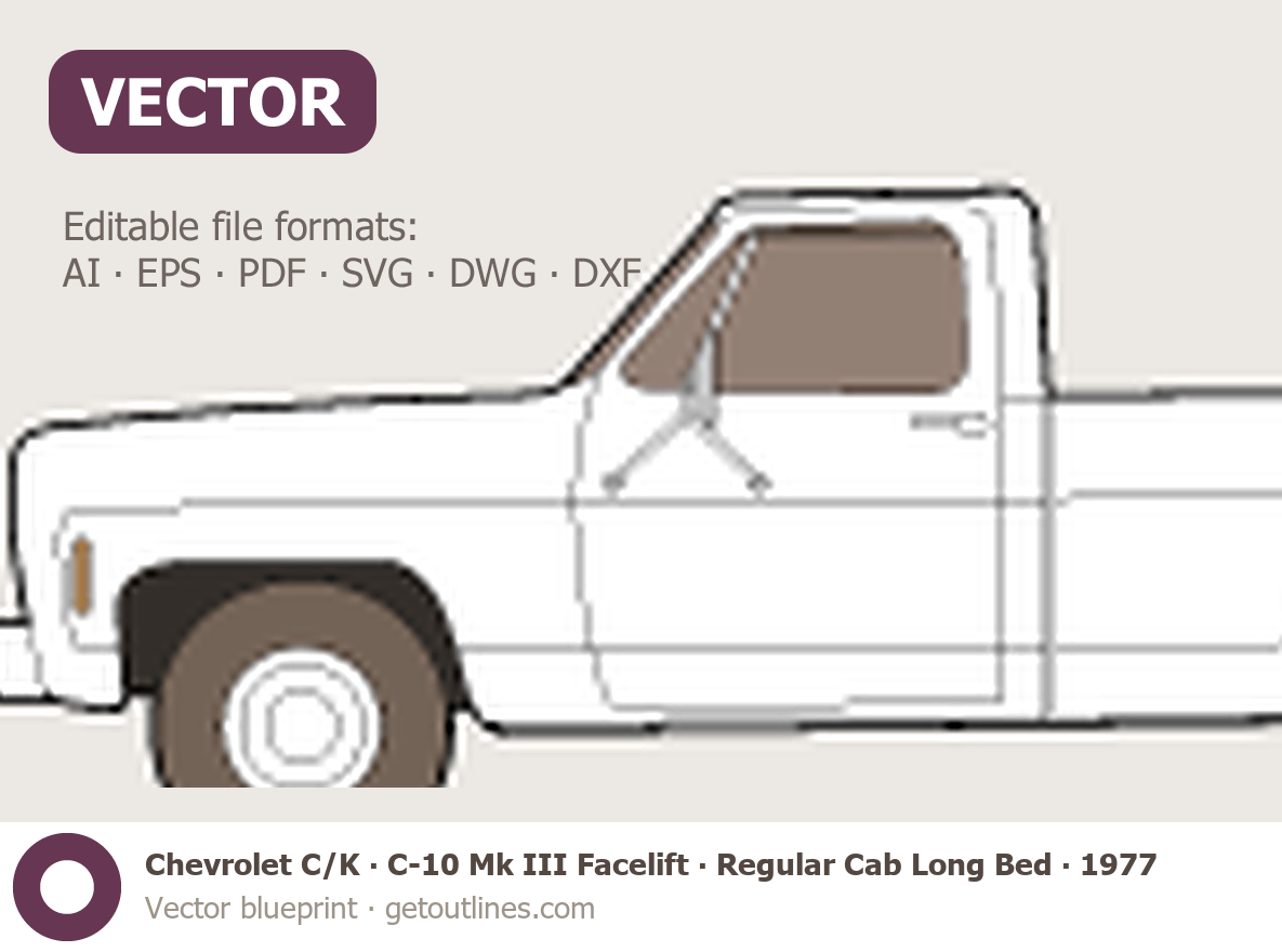 Buy this Chevrolet C/K C-10 Mk III Facelift blueprint and line drawing in high-quality editable vector file formats. Best for 3D and car wrap design.