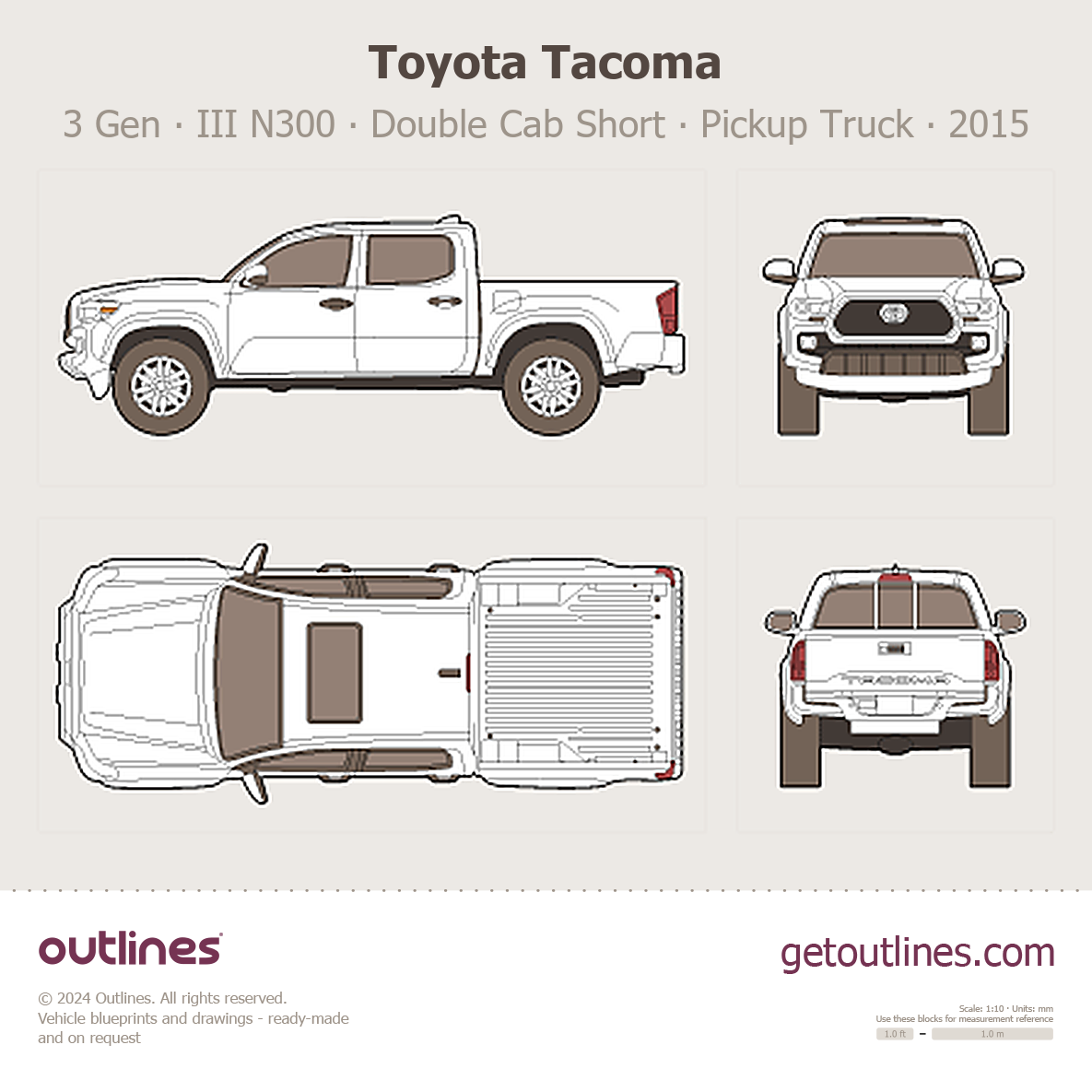 This is a blueprint of the Tacoma, produced by carmaker Toyota in 2015 - Present (2025, 2026). It features a Pickup Truck body design and is classified as a Commercial vehicle.