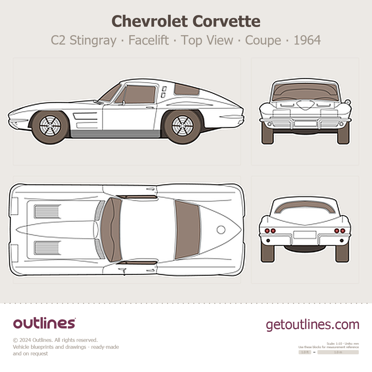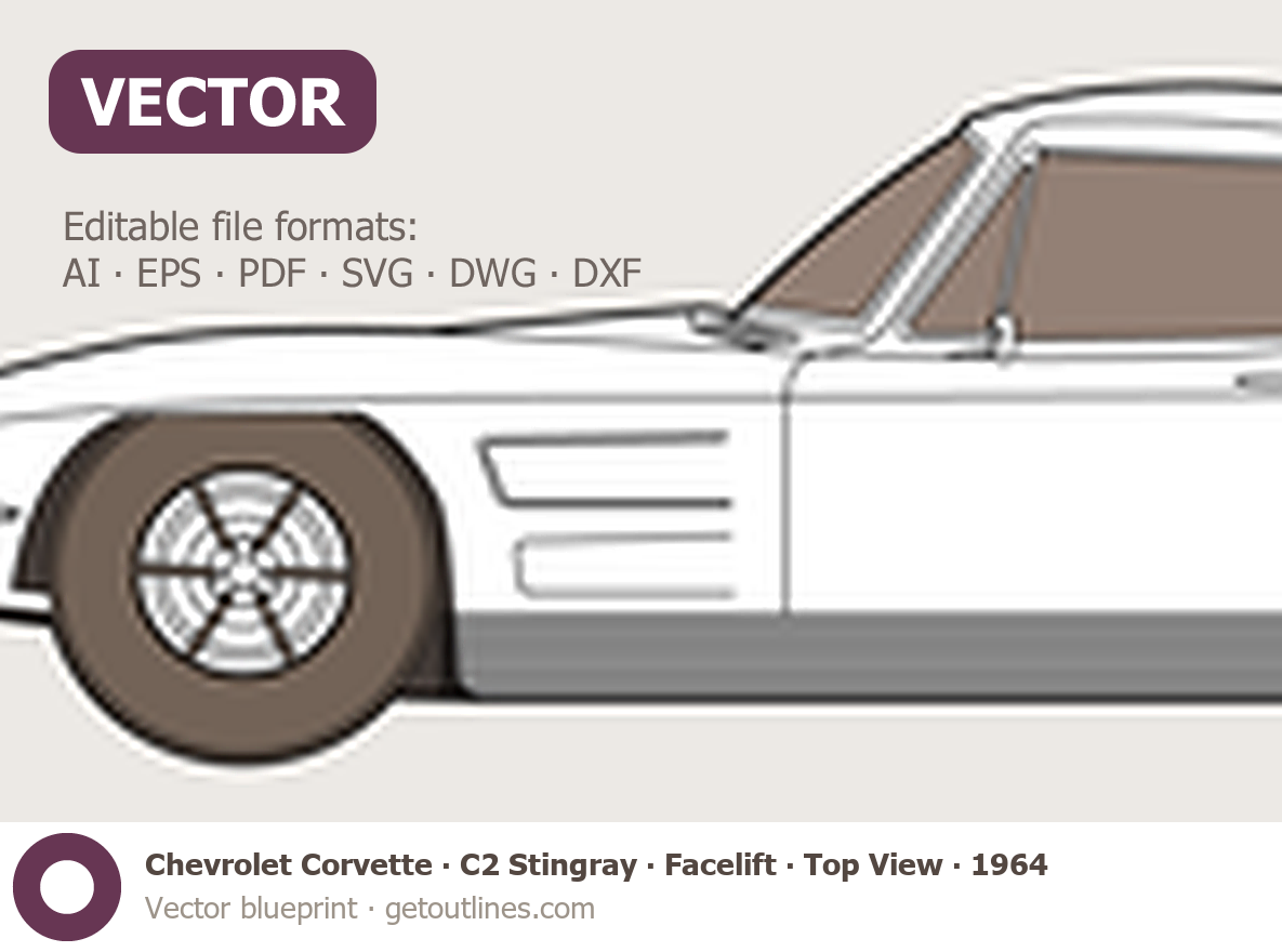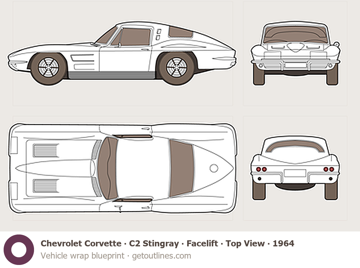 Buy this Chevrolet Corvette C2 Stingray ∙ Facelift blueprint and line drawing in high-quality editable vector file formats. Best for 3D and car wrap design.