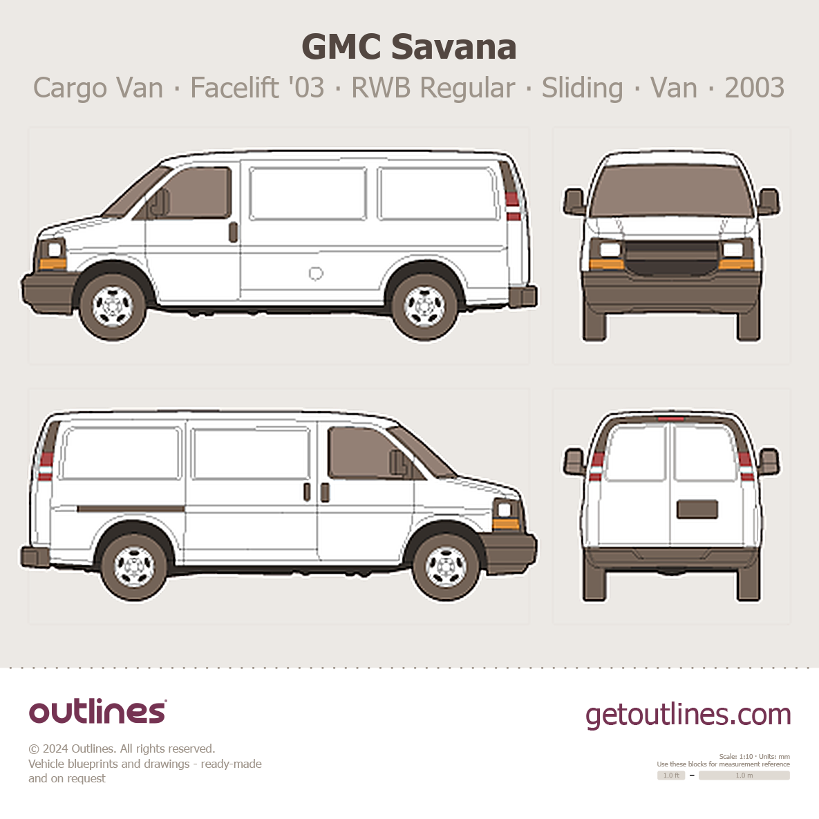 This 2003 GMC Savana Cargo Van ∙ Facelift '03 RWB Regular ∙ Sliding Door ∙ LS ∙ WT ∙ Work Van Van blueprint helps designers, wrap studios, and 3D artists simplify their workflow and save valuable time for creative work instead of routine tasks.
