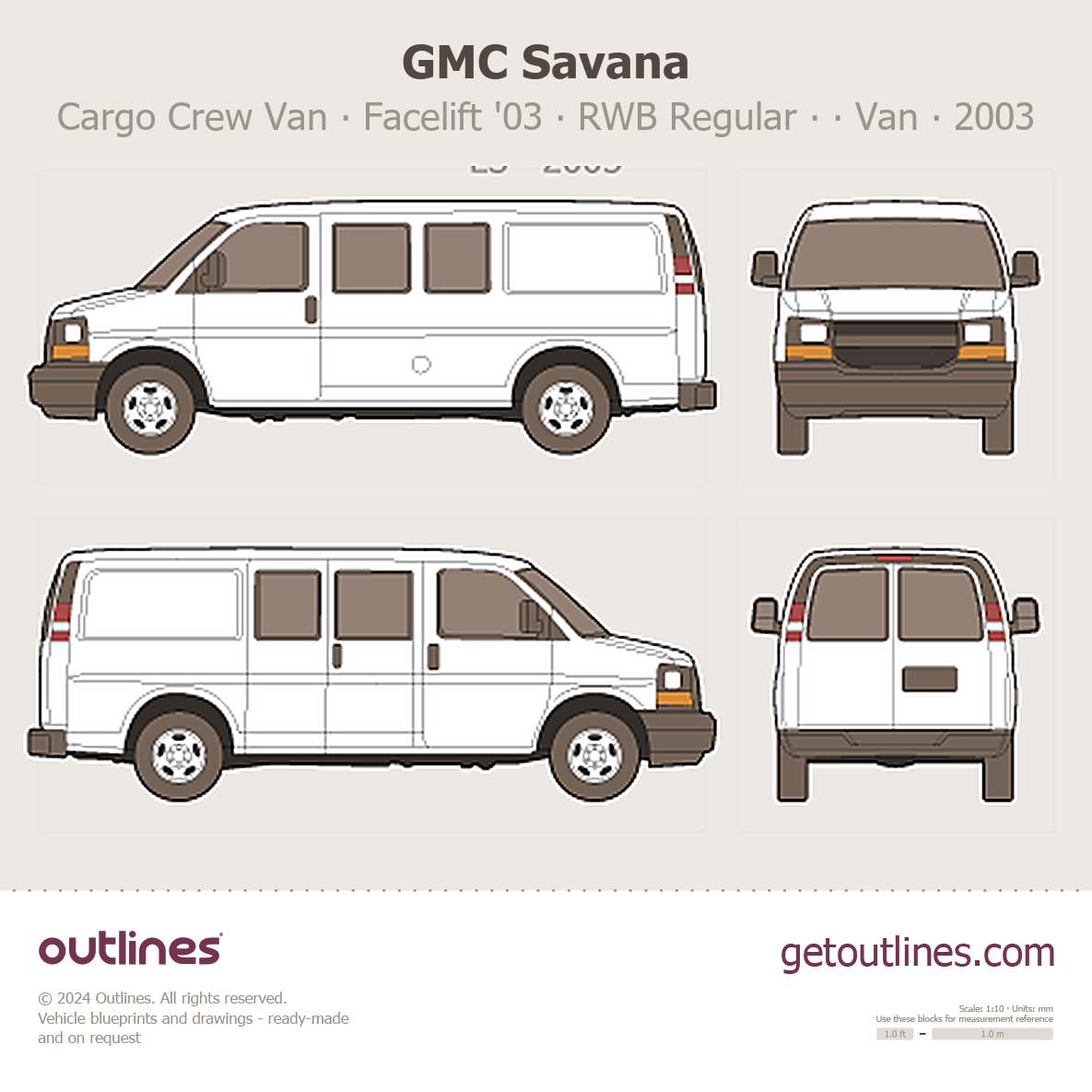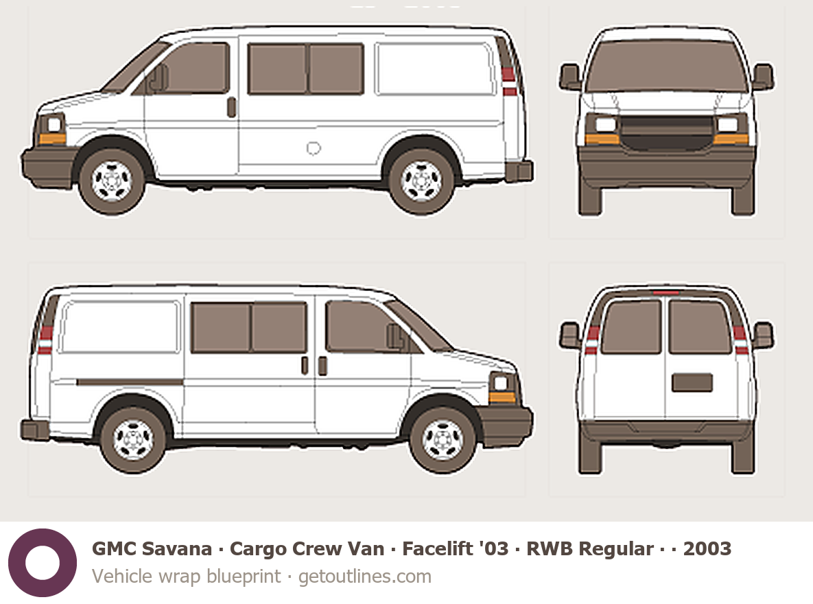 This 2003 GMC Savana Cargo Crew Van ∙ Facelift '03 RWB Regular ∙ 60/40 Doors ∙ LS ∙ WT ∙ 2nd-row seat option Van blueprint helps designers, wrap studios, and 3D artists simplify their workflow and save valuable time for creative work instead of routine tasks.