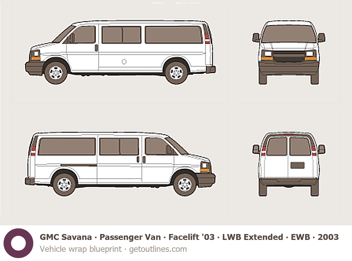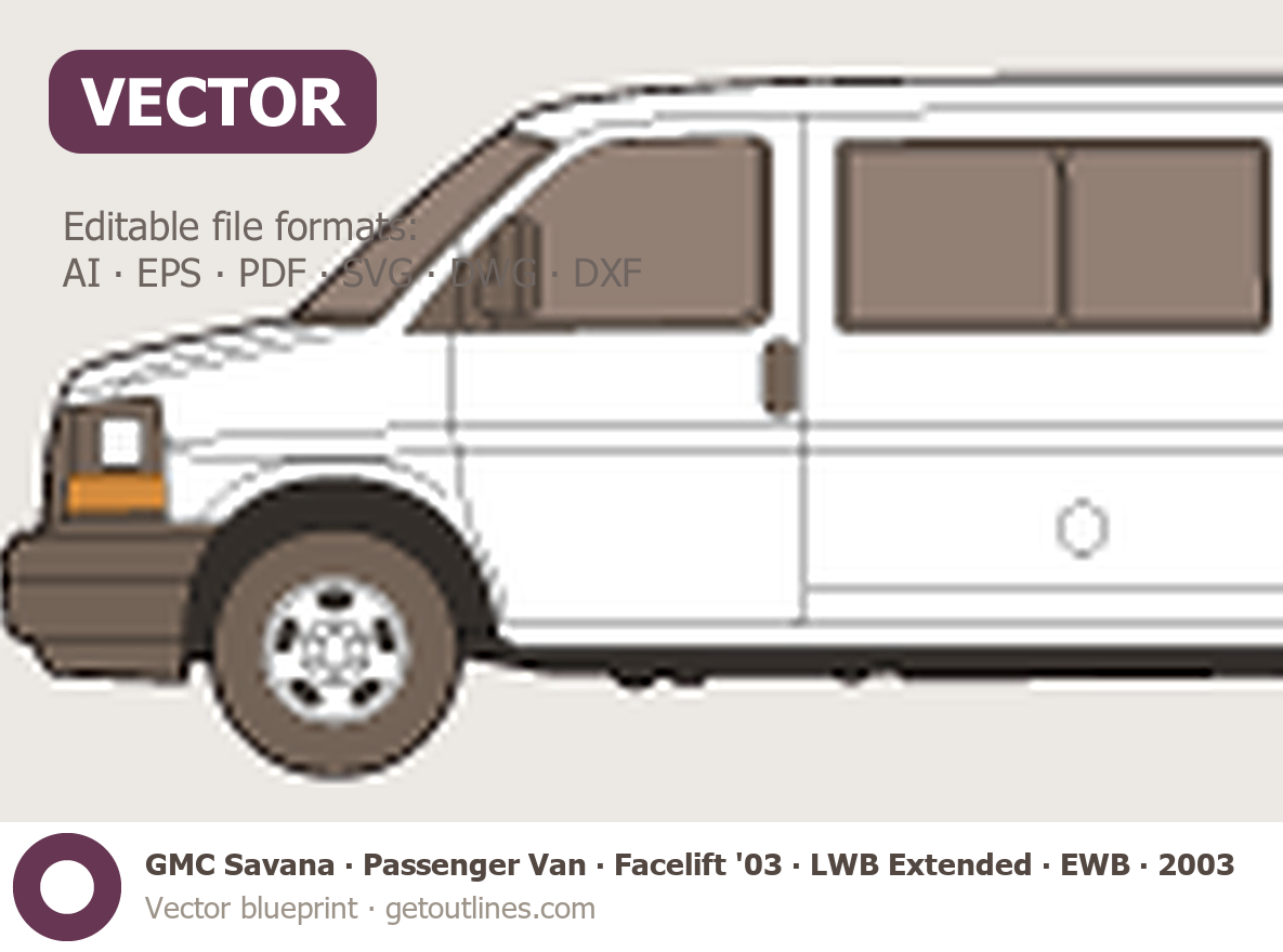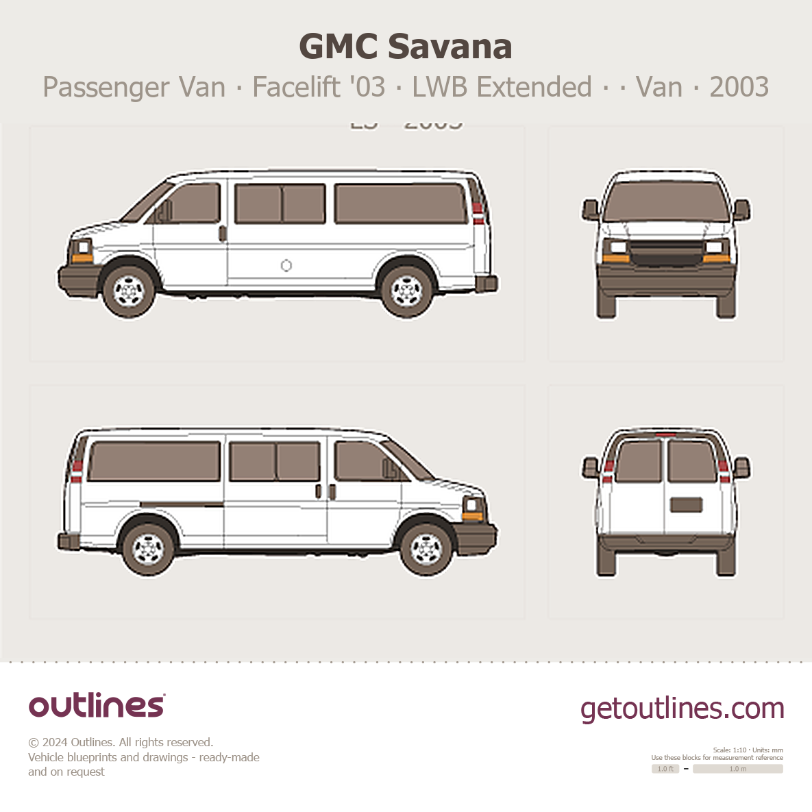 This 2003 GMC Savana Passenger Van ∙ Facelift '03 LWB Extended ∙ EWB ∙ Sliding Door ∙ LS ∙ WT Van blueprint helps designers, wrap studios, and 3D artists simplify their workflow and save valuable time for creative work instead of routine tasks.