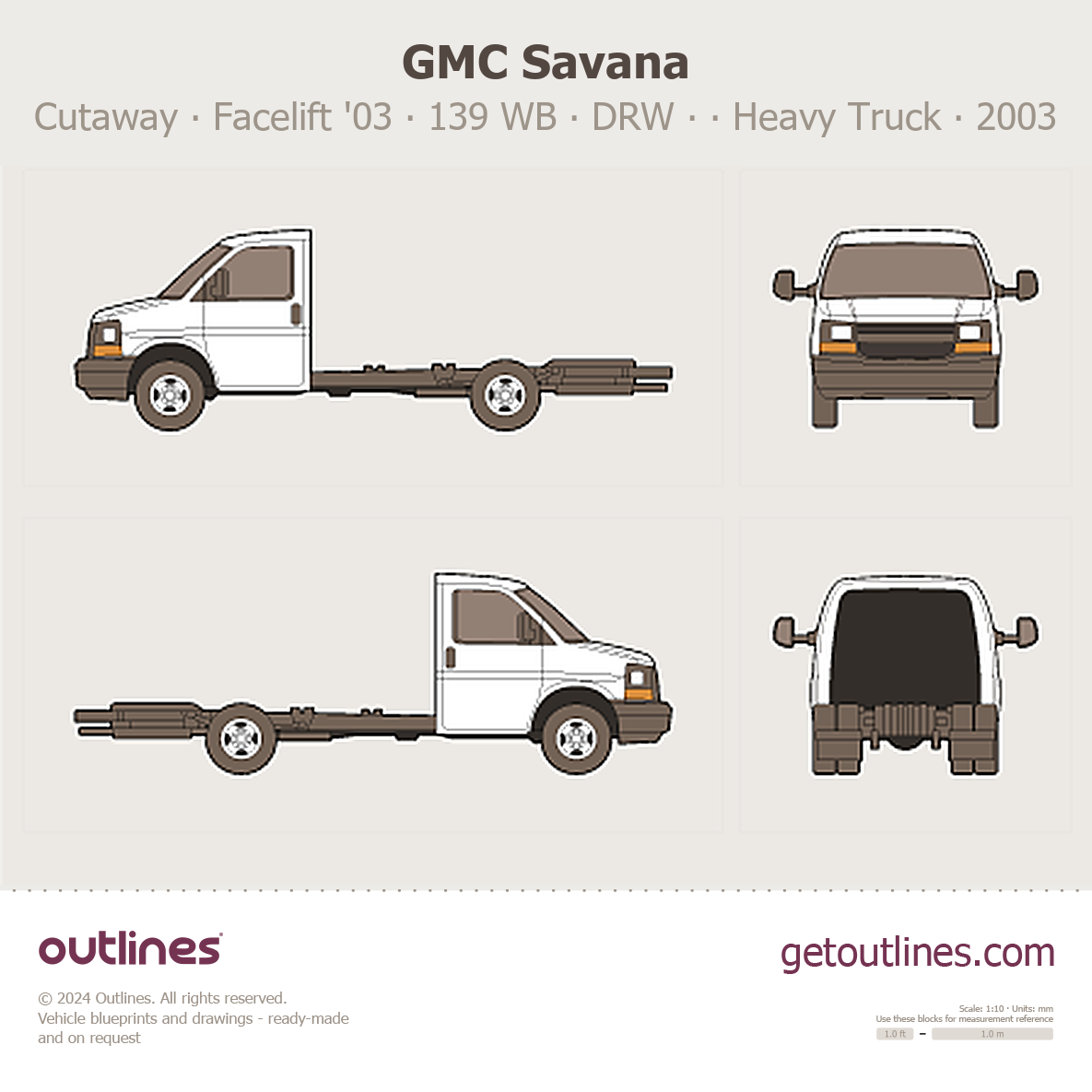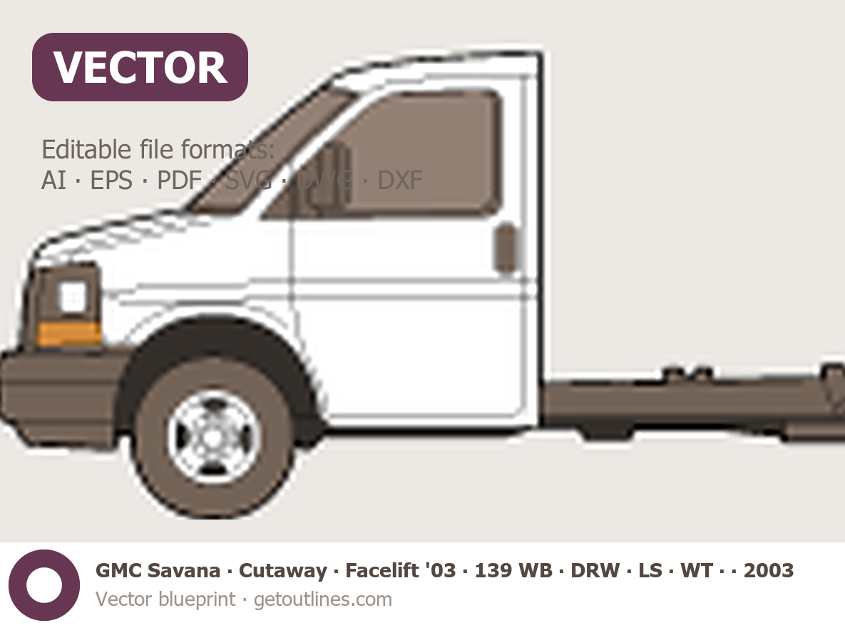 This 2003 GMC Savana Cutaway ∙ Facelift '03 139 WB ∙ DRW ∙ LS ∙ WT ∙ CA Chassis Heavy Truck blueprint helps designers, wrap studios, and 3D artists simplify their workflow and save valuable time for creative work instead of routine tasks.