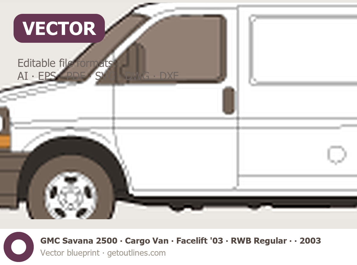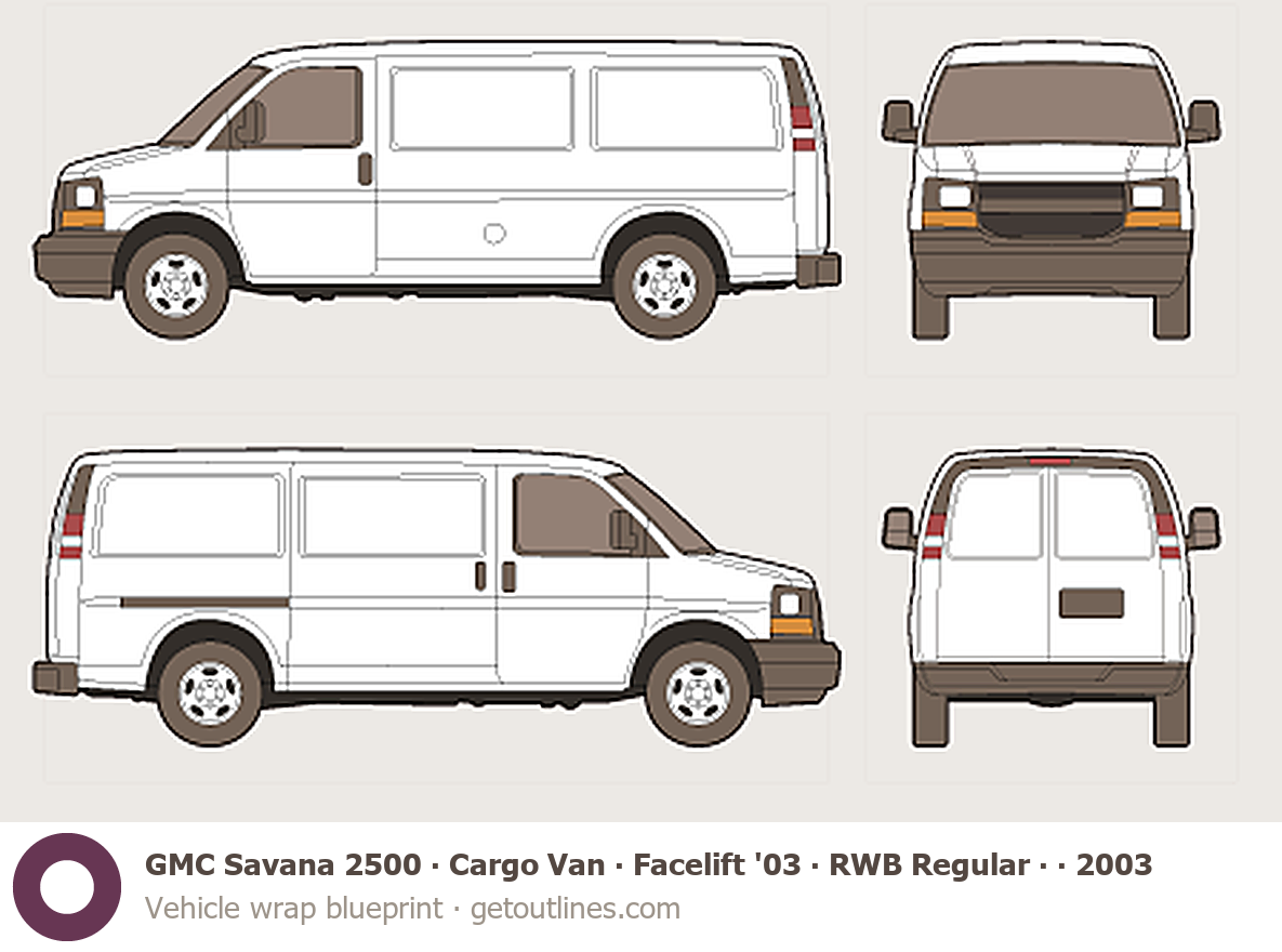 This 2003 GMC Savana 2500 Cargo Van ∙ Facelift '03 RWB Regular ∙ Sliding Door ∙ LS ∙ WT ∙ Work Van ∙ G2500 Van blueprint helps designers, wrap studios, and 3D artists simplify their workflow and save valuable time for creative work instead of routine tasks.