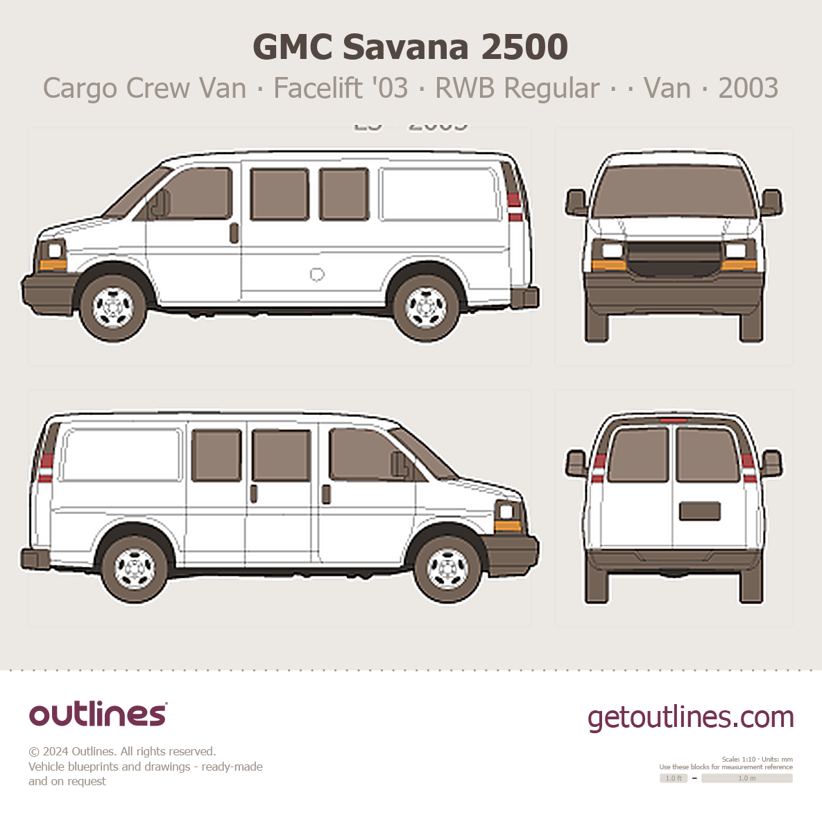 This 2003 GMC Savana 2500 Cargo Crew Van ∙ Facelift '03 RWB Regular ∙ 60/40 Doors ∙ LS ∙ WT ∙ 2nd-row seat option ∙ G2500 Van blueprint helps designers, wrap studios, and 3D artists simplify their workflow and save valuable time for creative work instead of routine tasks.