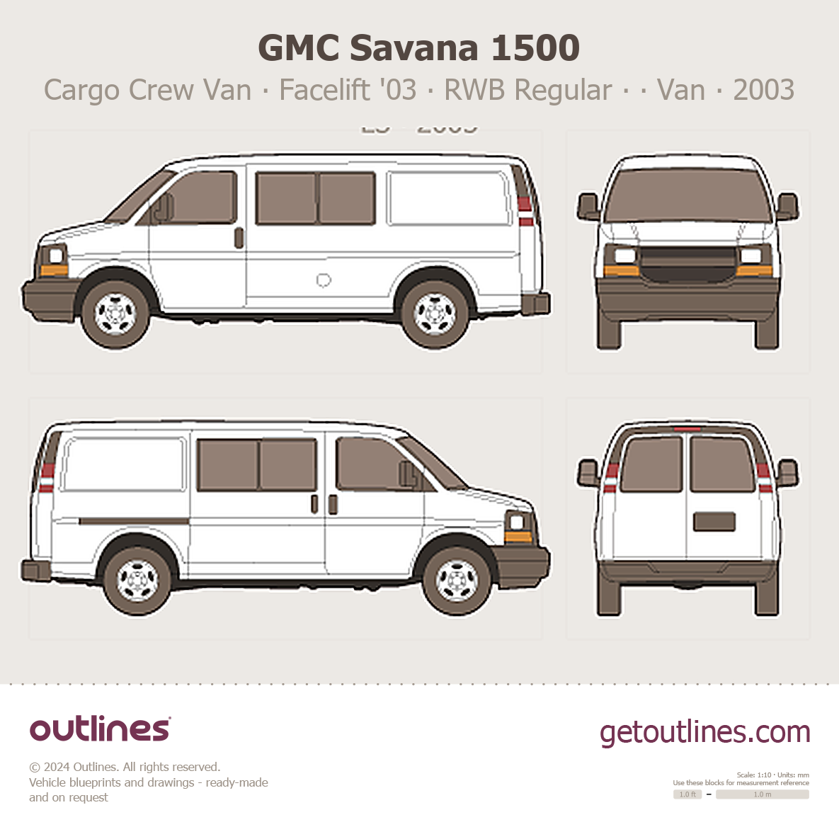This 2003 GMC Savana 1500 Cargo Crew Van ∙ Facelift '03 RWB Regular ∙ Sliding Door ∙ LS ∙ WT ∙ 2nd-row seat option ∙ G1500 Van blueprint helps designers, wrap studios, and 3D artists simplify their workflow and save valuable time for creative work instead of routine tasks.