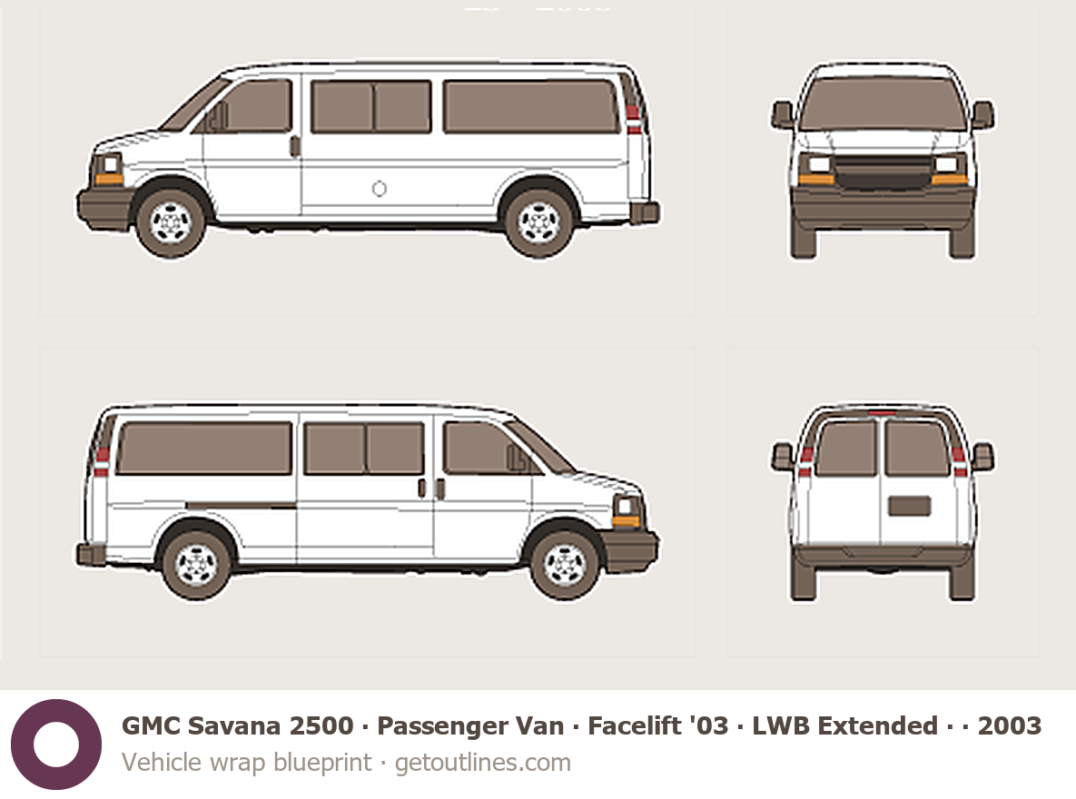 This 2003 GMC Savana 2500 Passenger Van ∙ Facelift '03 LWB Extended ∙ EWB ∙ Sliding Door ∙ LS ∙ WT ∙ G2500 Van blueprint helps designers, wrap studios, and 3D artists simplify their workflow and save valuable time for creative work instead of routine tasks.