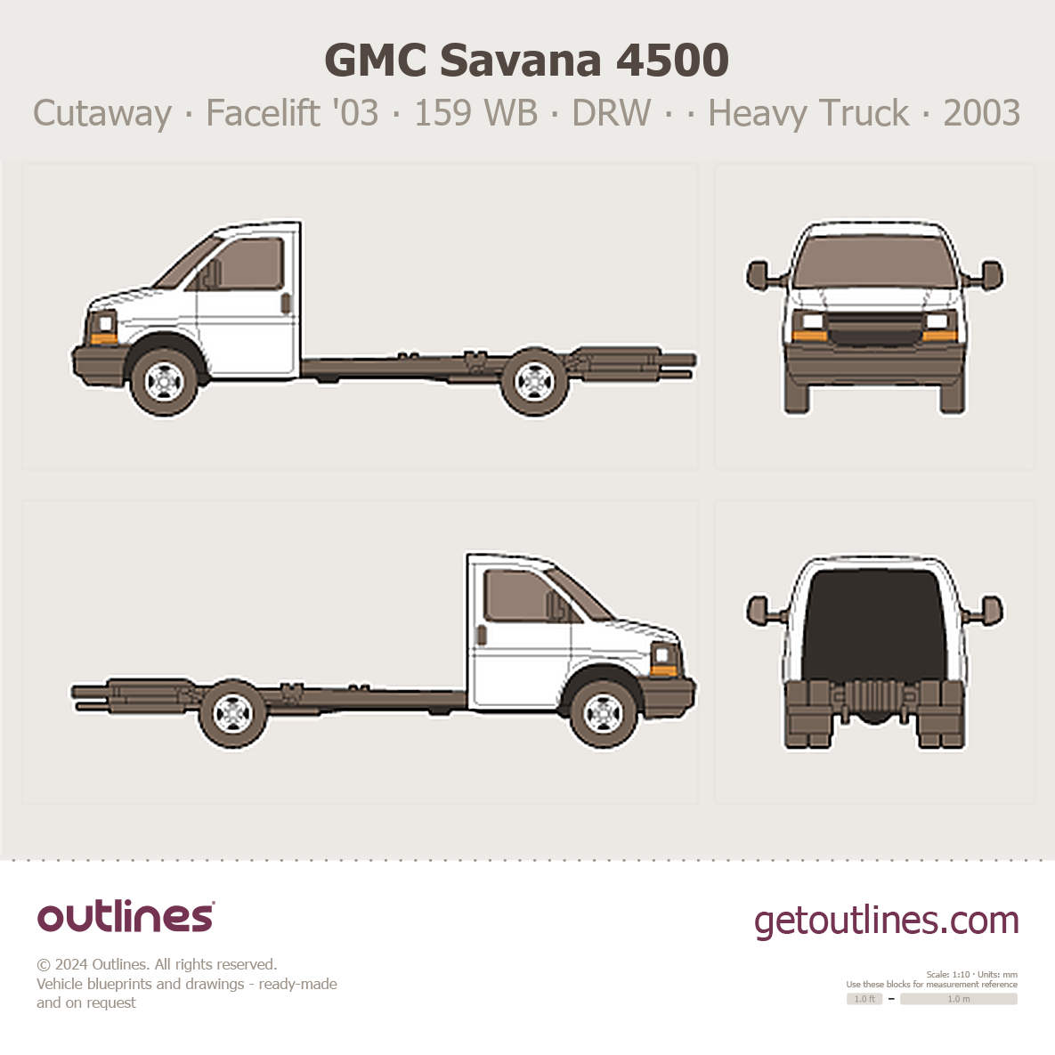 This 2003 GMC Savana 4500 Cutaway ∙ Facelift '03 159 WB ∙ DRW ∙ LS ∙ WT ∙ G4500 Heavy Truck blueprint helps designers, wrap studios, and 3D artists simplify their workflow and save valuable time for creative work instead of routine tasks.