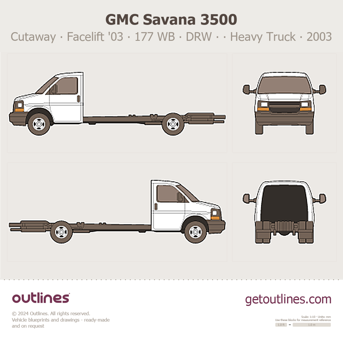 This 2003 GMC Savana 3500 Cutaway ∙ Facelift '03 177 WB ∙ DRW ∙ LS ∙ WT ∙ G3500 Heavy Truck blueprint helps designers, wrap studios, and 3D artists simplify their workflow and save valuable time for creative work instead of routine tasks.