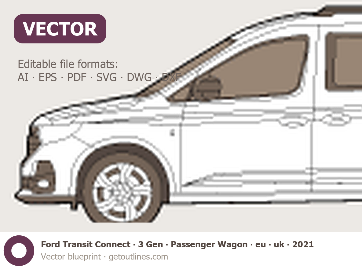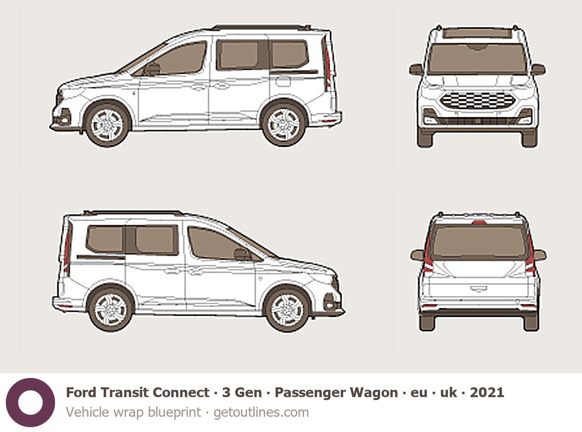 This 2021 Ford Transit Connect 3 Gen Passenger Wagon ∙ eu ∙ uk Wagon blueprint helps designers, wrap studios, and 3D artists simplify their workflow and save valuable time for creative work instead of routine tasks.