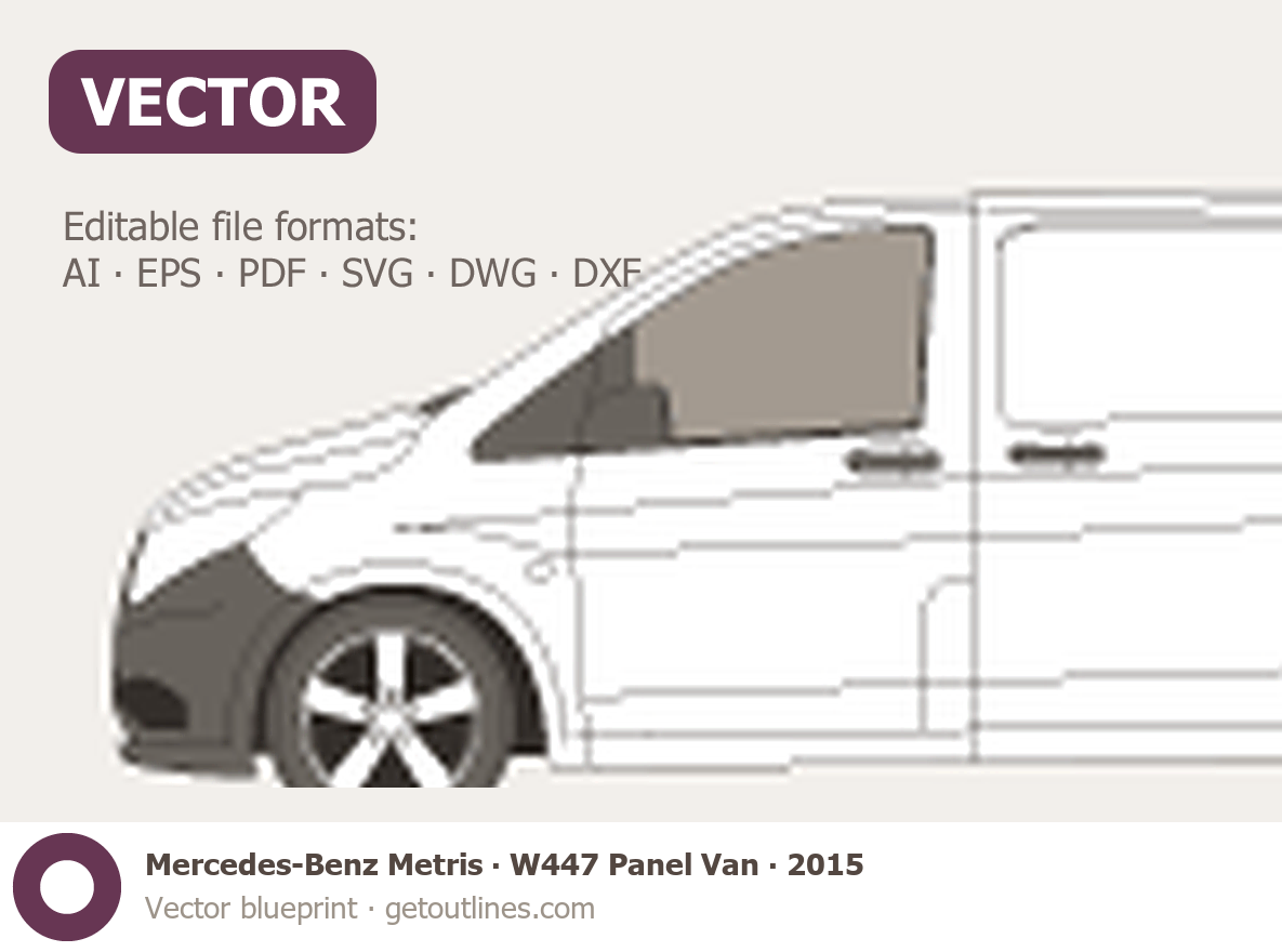 This 2015 Mercedes-Benz Metris W447 Panel Van Van blueprint helps designers, wrap studios, and 3D artists simplify their workflow and save valuable time for creative work instead of routine tasks.