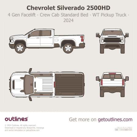 Buy this Chevrolet Silverado 2500HD 4 Gen Facelift blueprint and line drawing in high-quality editable vector file formats. Best for 3D and car wrap design.