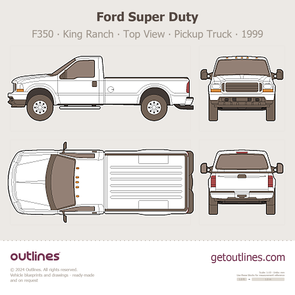 This 1999 Ford Super Duty F350 King Ranch ∙ Top View Pickup Truck blueprint helps designers, wrap studios, and 3D artists simplify their workflow and save valuable time for creative work instead of routine tasks.