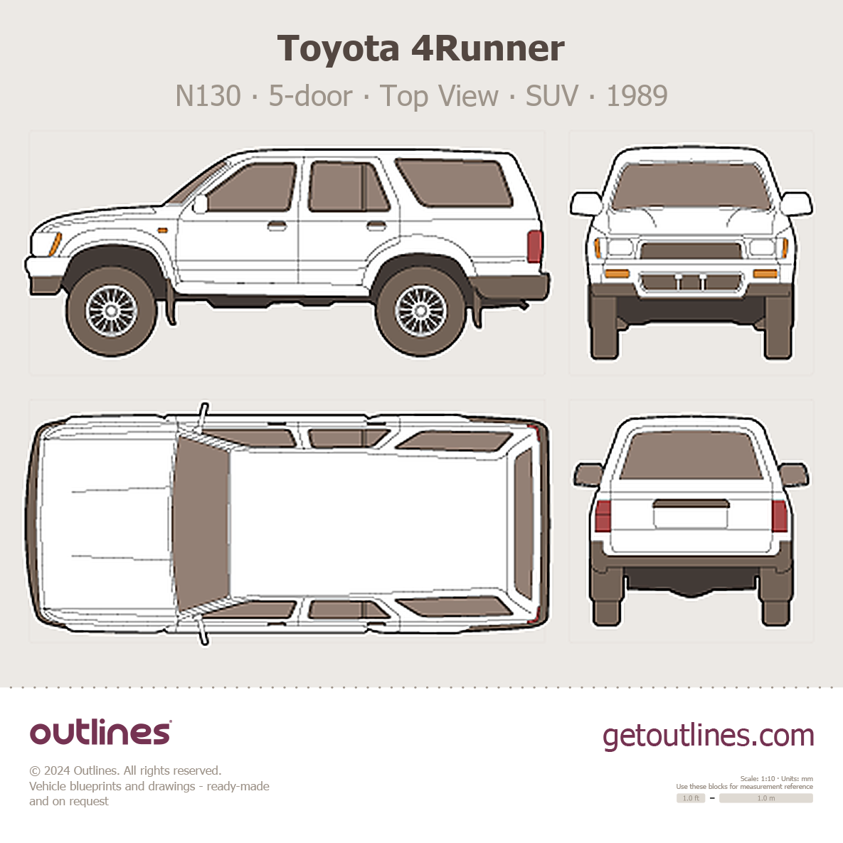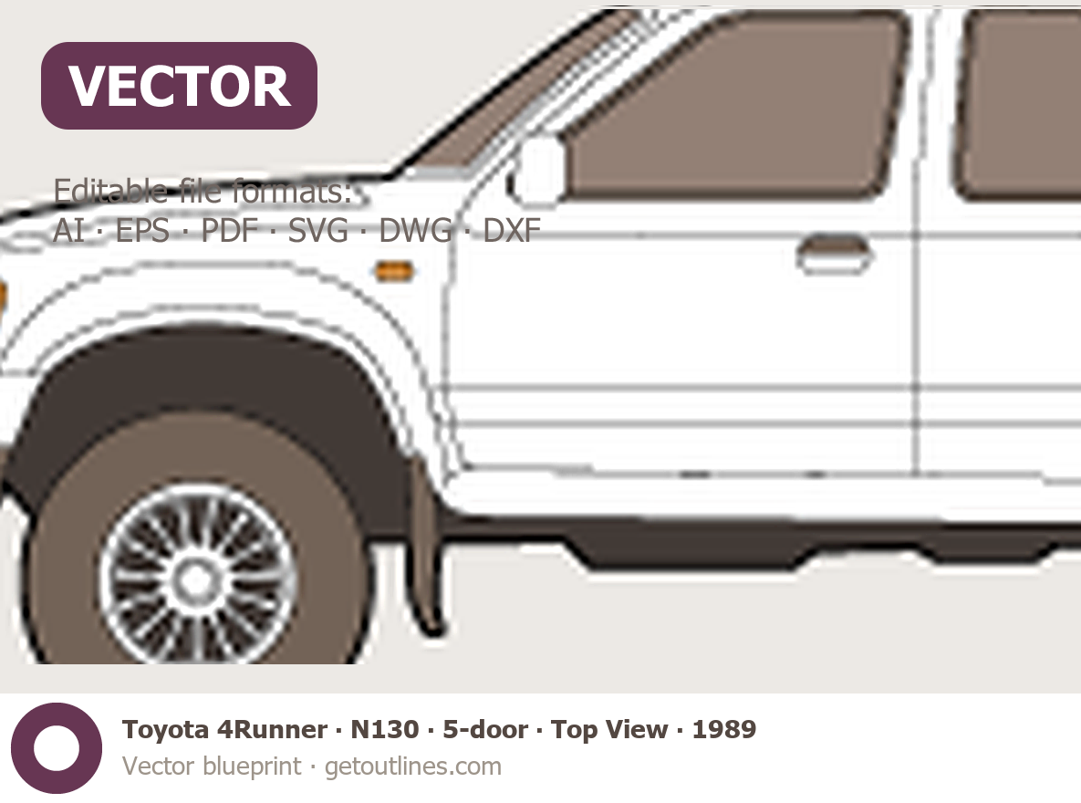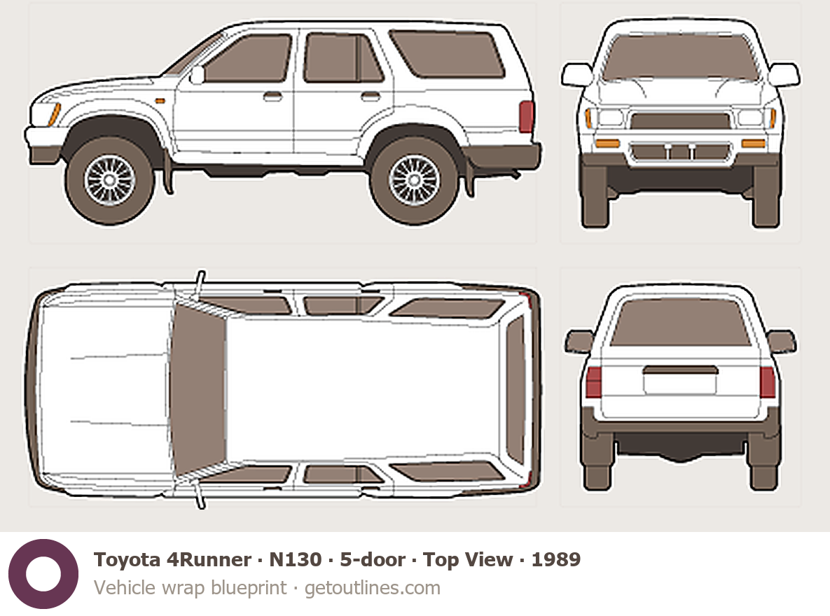 This 1989 Toyota 4Runner N130 5-door ∙ Top View SUV blueprint helps designers, wrap studios, and 3D artists simplify their workflow and save valuable time for creative work instead of routine tasks.
