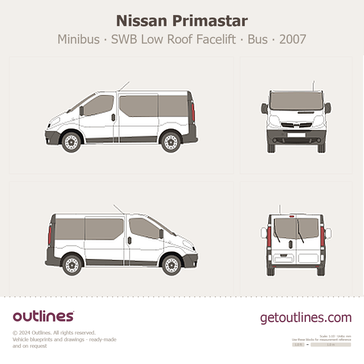 This 2007 Nissan Primastar Minibus SWB Low Roof Facelift Bus blueprint helps designers, wrap studios, and 3D artists simplify their workflow and save valuable time for creative work instead of routine tasks.